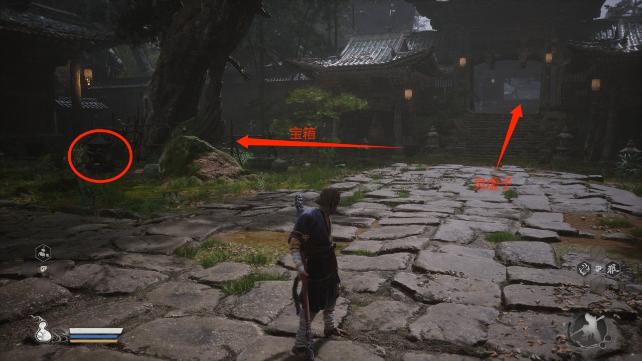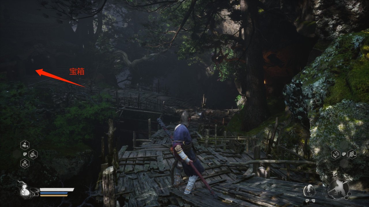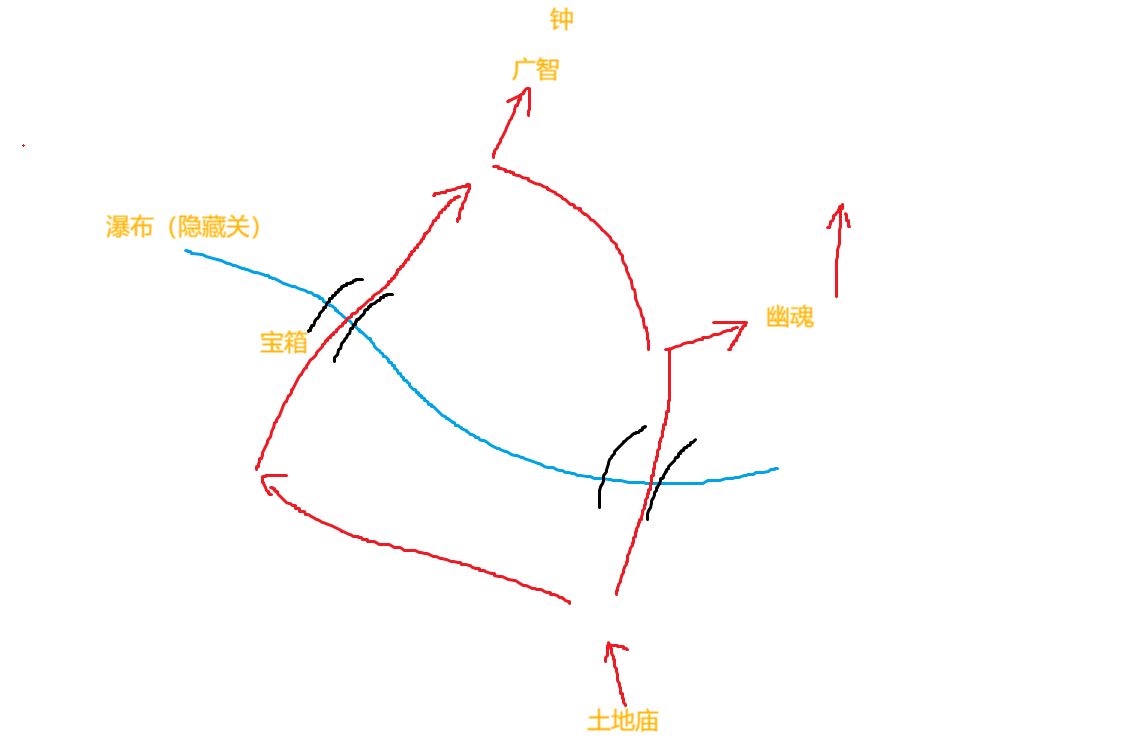 這一片區域大致路線就是這樣,主要是拿了那個寶箱就行,然後過橋可以看到一個弓箭手,按棍花可以擋遠程。幽魂和廣智的順序建議先打廣智,簡單一點。