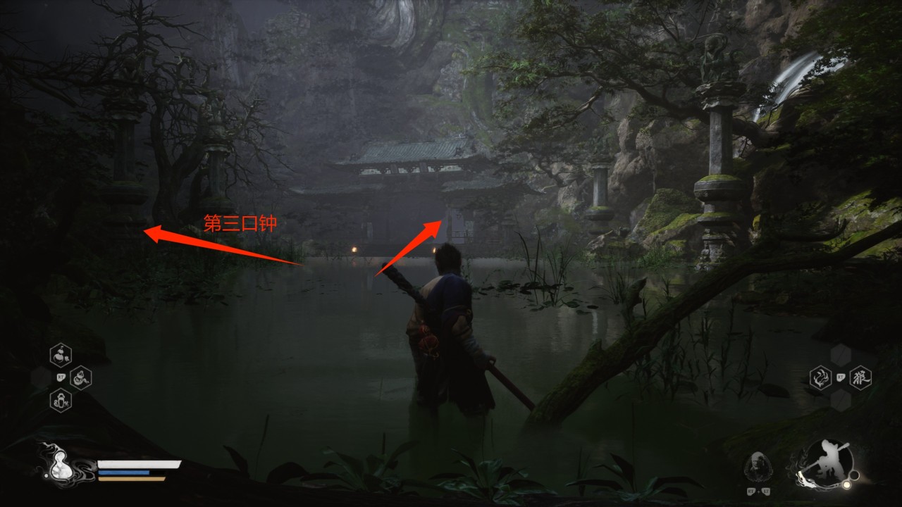 打完白衣不要直接往前,先往左走進山洞去敲第三口鐘,敲鐘前請務必保證幽魂已擊敗,不然幽魂會消失,只能下週目再見了。
