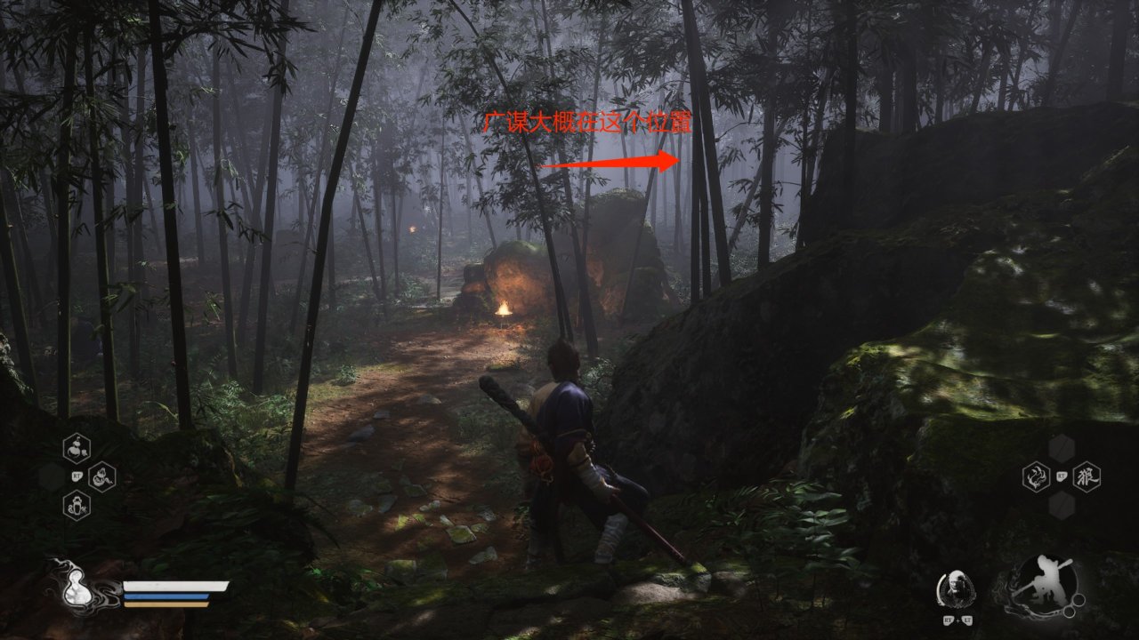 回到竹林去探索。沒有什麼很重要的東西,走石子路去打廣謀就可以了。
