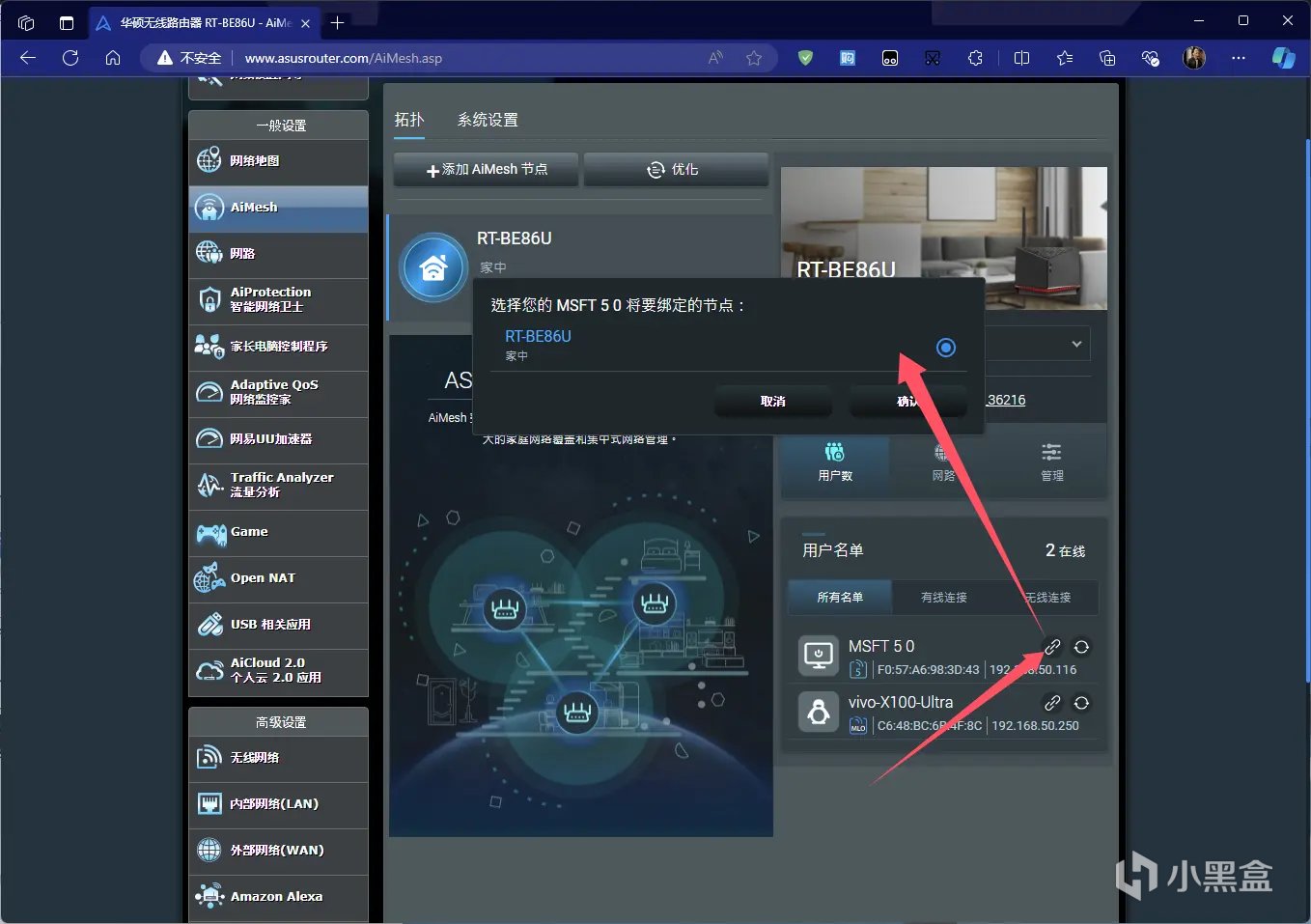 华硕的AiMesh技术在这方面属于第一梯队,只要支持Mesh都可进行组网。最爽的一点是可在管理界面设置节点绑定,手动为家中的各类网络设备指定节点,在信号重叠区域避免它们抽风乱连。