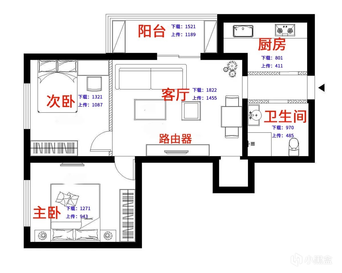 为了方便展示,我通过NAS搭建SPEEDTEST软件,NAS万兆接口与BE86万兆接口相连接,通过手机测速,将家里各点的测试速率在下图进行标注。