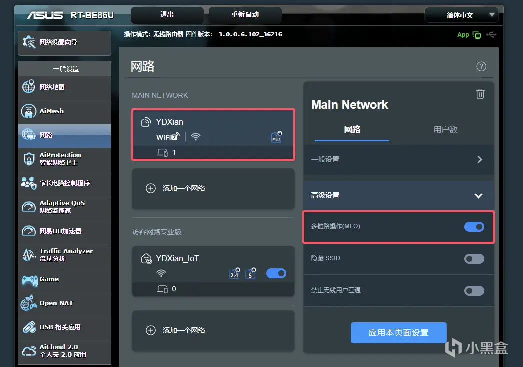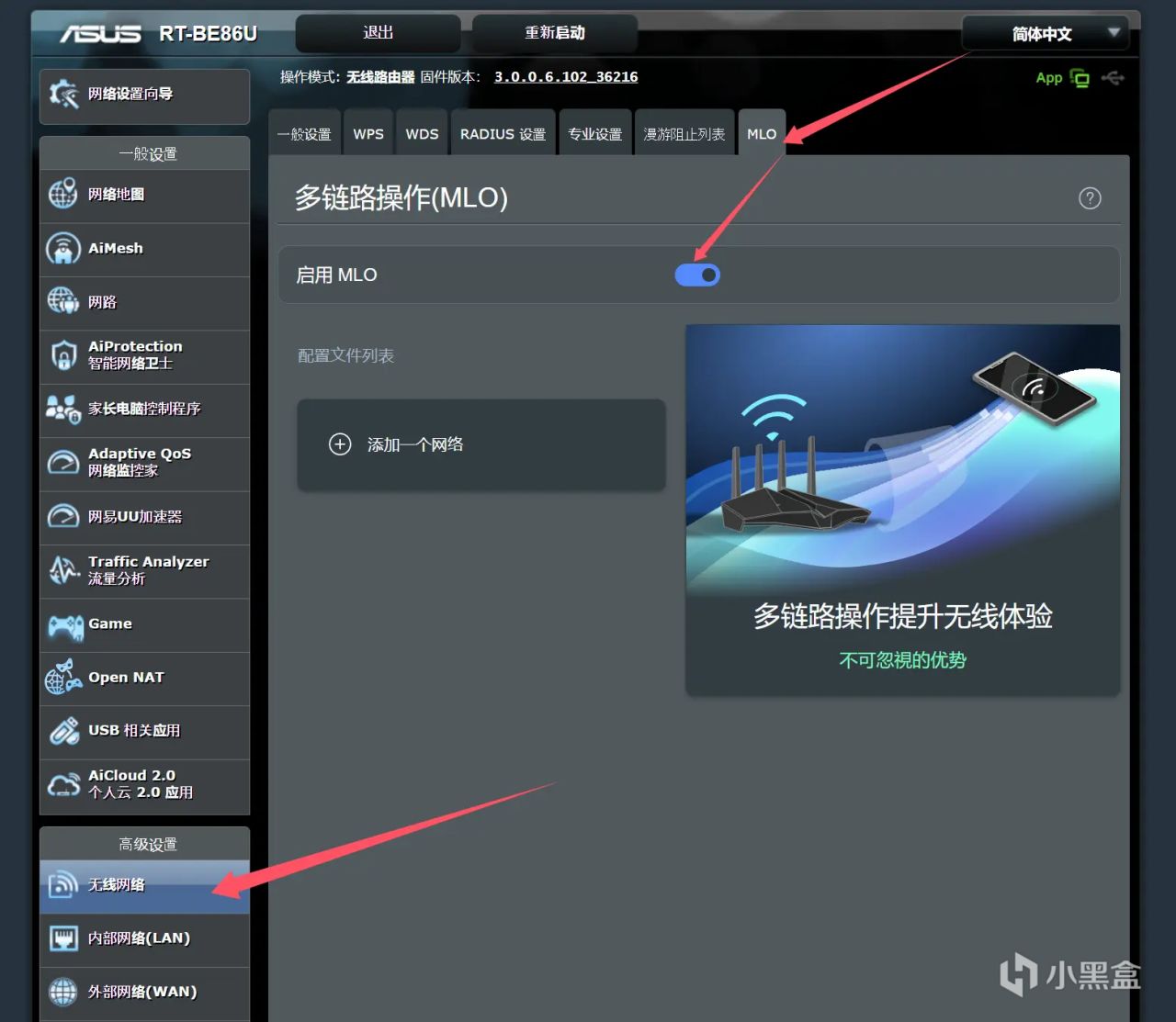 如果没有或不能开启MLO也不必担心,只需要在高级设置中点击无线网络,选择MLO并启用。