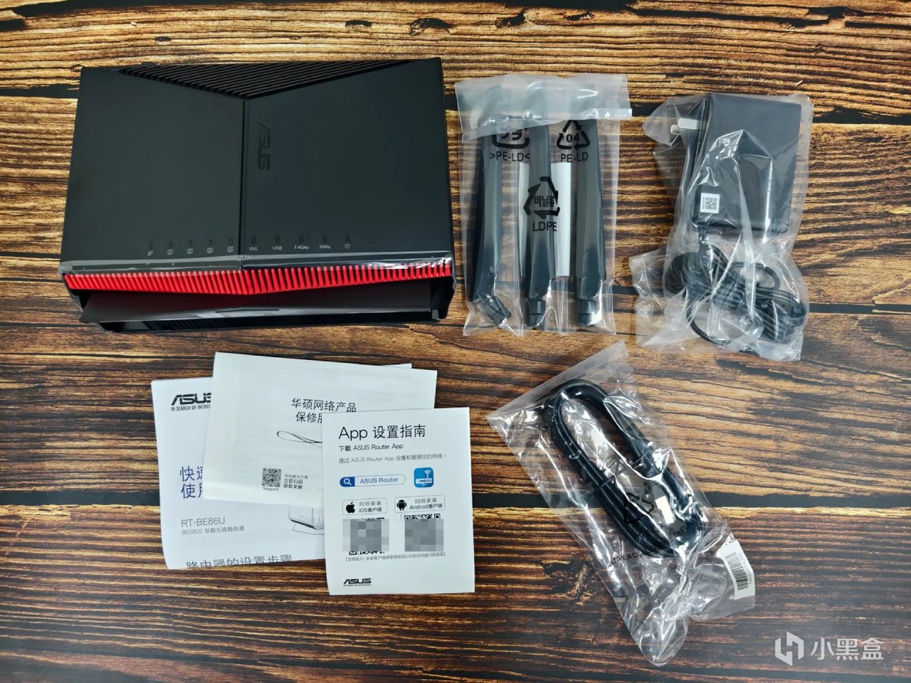 华硕的产品包装一贯低调大气,即便是非ROG系列产品也有着相同待遇。不过BE86U在包装方式与AX86U有些许不同,由抽拉改为侧盖,变得更加人性化。