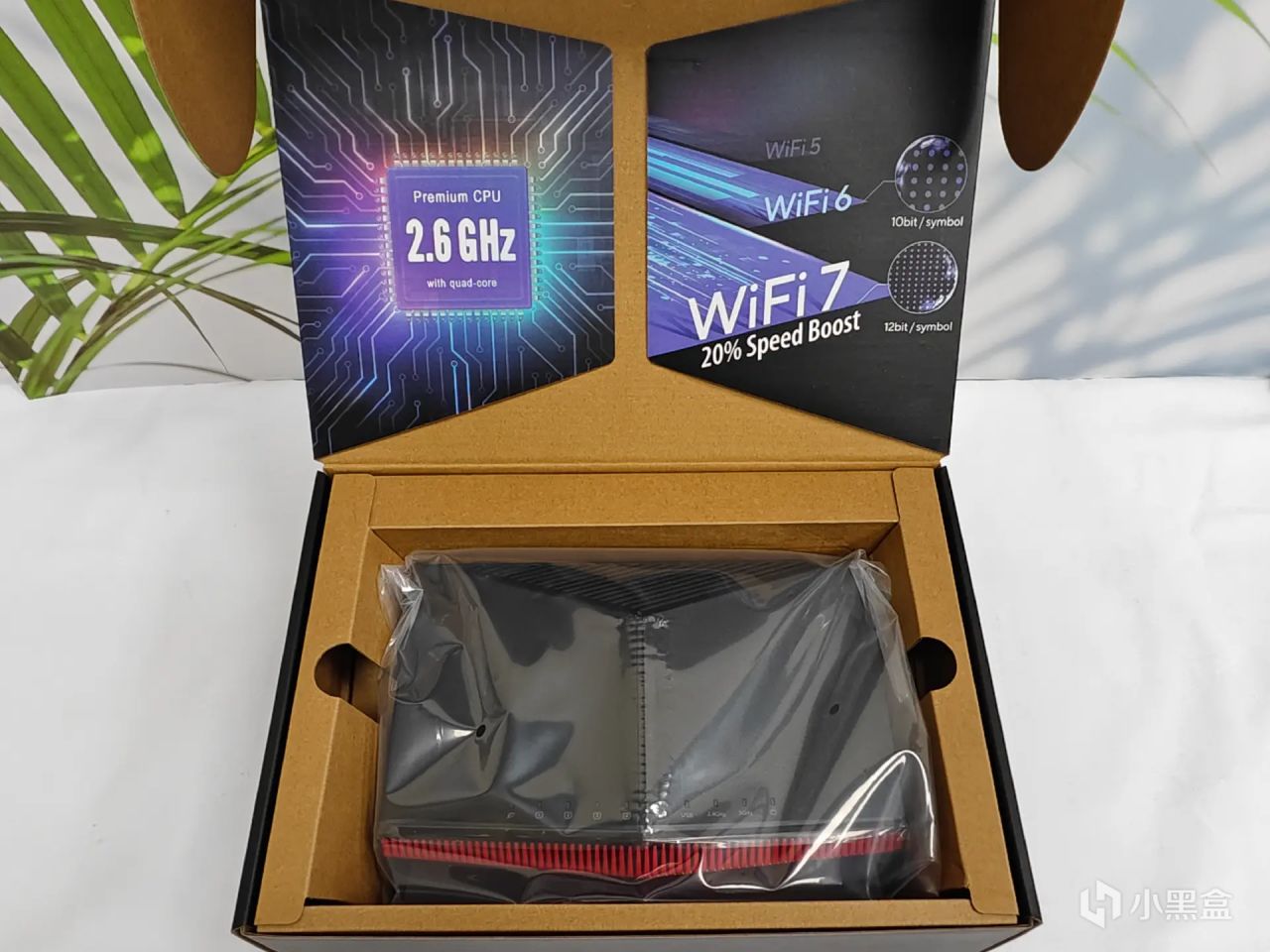 掀开便能看到本体,内侧附有重要信息:搭载博通四核2.6GHz旗舰级处理器,支持的WiFi 7技术对比前代速度提升20%。还可以发现,内托也由纸浆模塑换成瓦楞,开箱体验确实提升不少。
