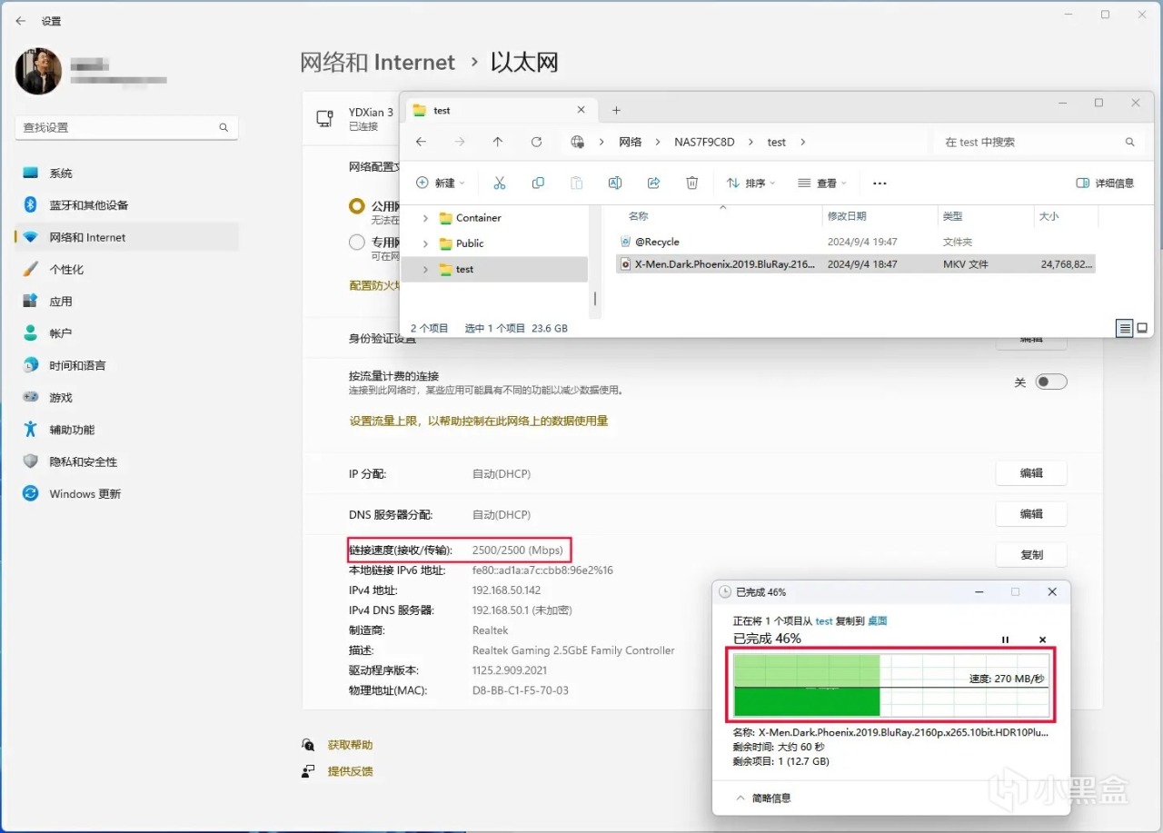由于笔记本电脑是GP76仅支持WiFi6e没办法测,不过好在有2.5G网口,通过路由器将NAS用SMB挂载到电脑进行测试。全程稳定,轻松无压力。
