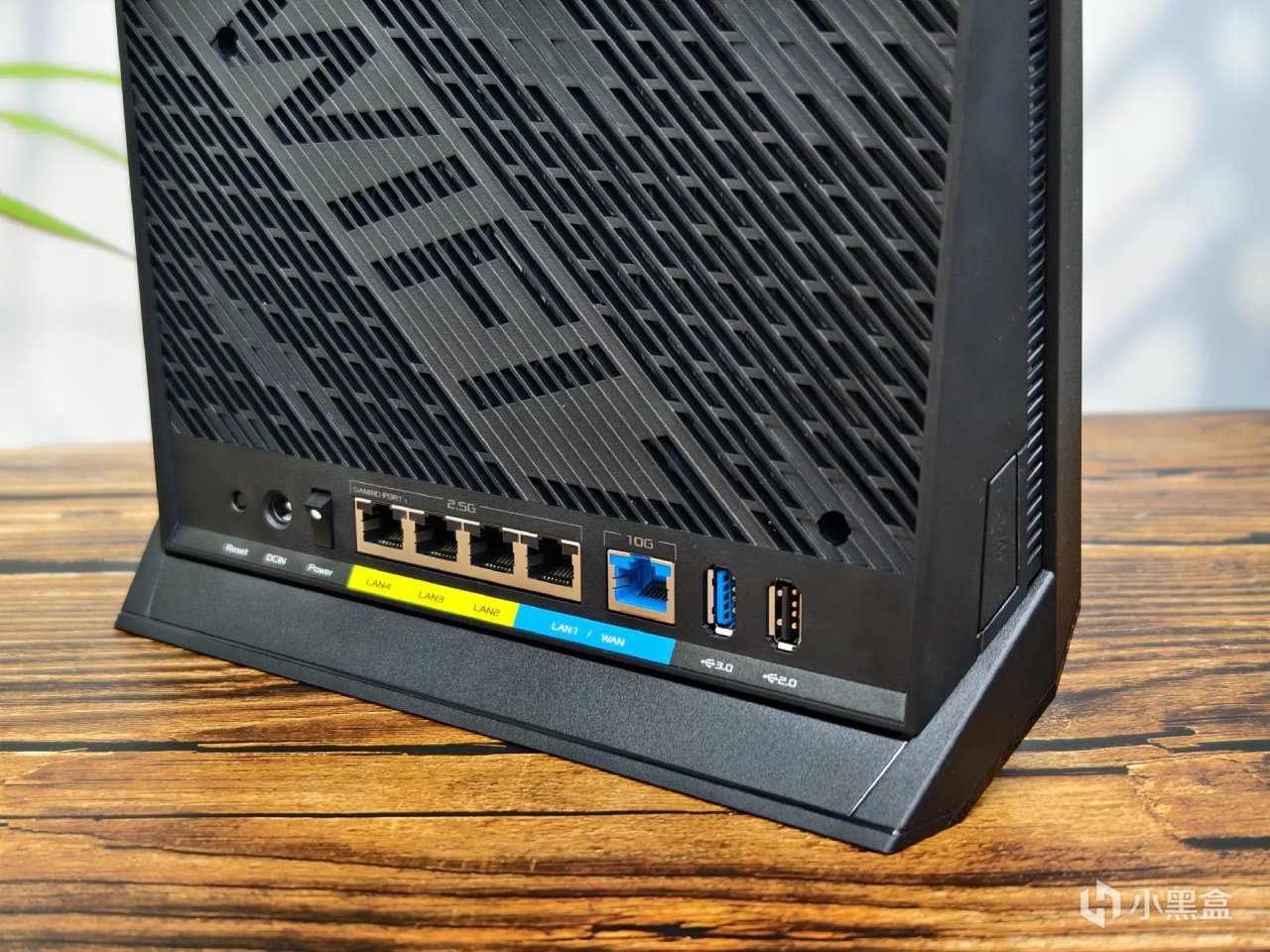 转到背部,这才是让人最兴奋的地方,大面积镂空格栅中间有一个WiFi7字样。底部一个万兆10G和四个2.5G接口,这网口配置实用性增加了太多。最左侧的LAN4为Gaming游戏接口,对游戏数据包会加速收发,能提供更低的延迟和更高的稳定性,游戏发烧友不要错过。