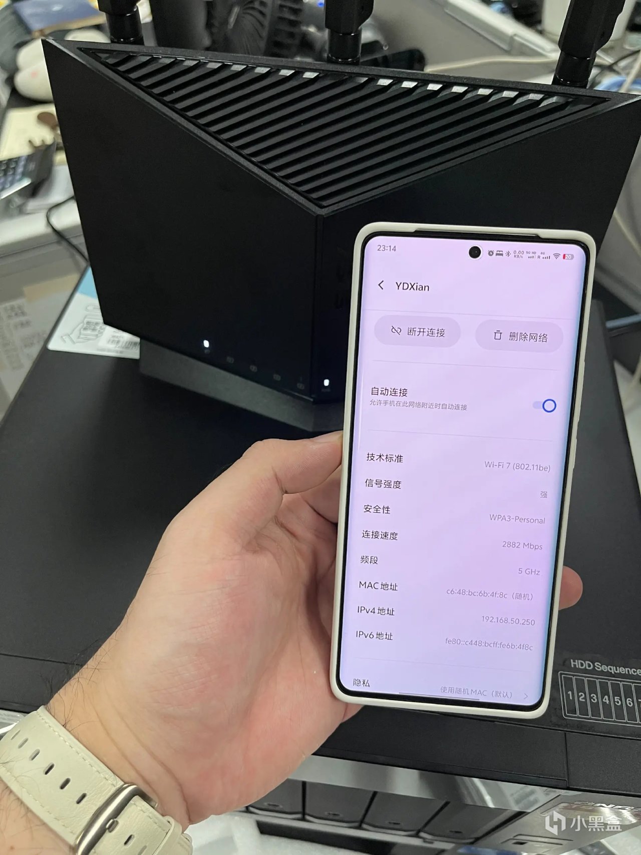 接着上面,WiFi7下,开启MLO,手持设备为vivo X100 Ultra。连接无线网络,可以看到已经出现WiFi7标识,表明当前已经在WiFi7协议下运行。