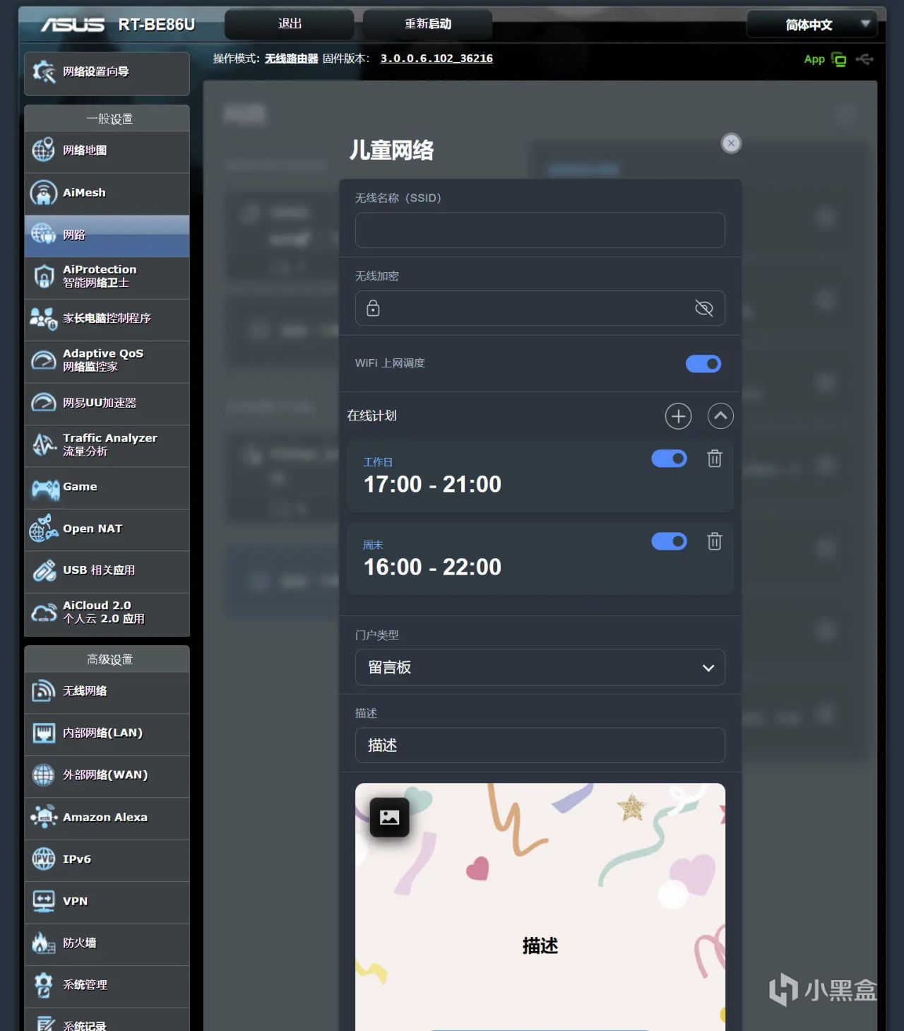 华硕在路由器的无线网络领域相当专业,具备极为丰富的可配置选项:访问门户、访问网络、物联网网络、儿童网络、自定义网络等,基本能覆盖到各种使用场景。尤其是儿童网络,现在孩子人手一台手机平板,创建一个专用网络再配合家长电脑控制程序,实在是省心省力。