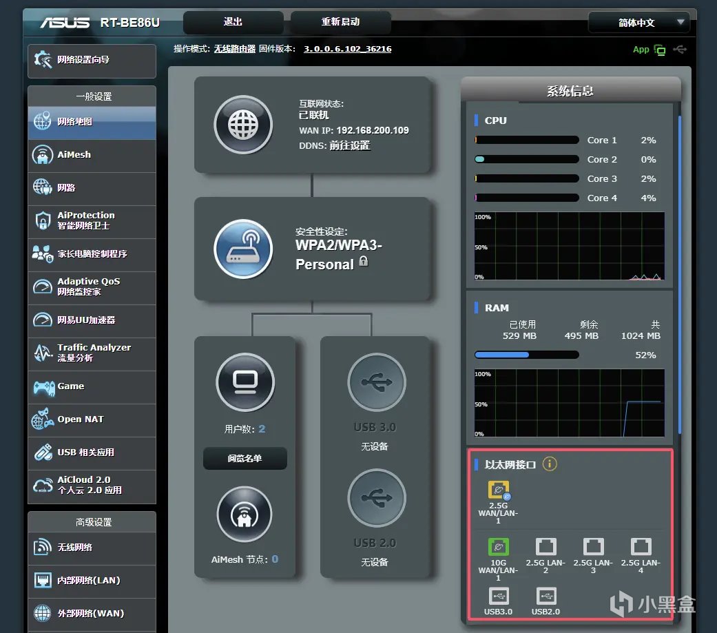 蓝色标注的2.5G LAN1 和 10G,为WAN/LAN复合口,连接光猫、NAS、交换机都非常不错,灵活性拉满。后期我便准备将10G连接万兆交换机,把家中所有NAS都迁移到交换机下由BE86U统一管理。