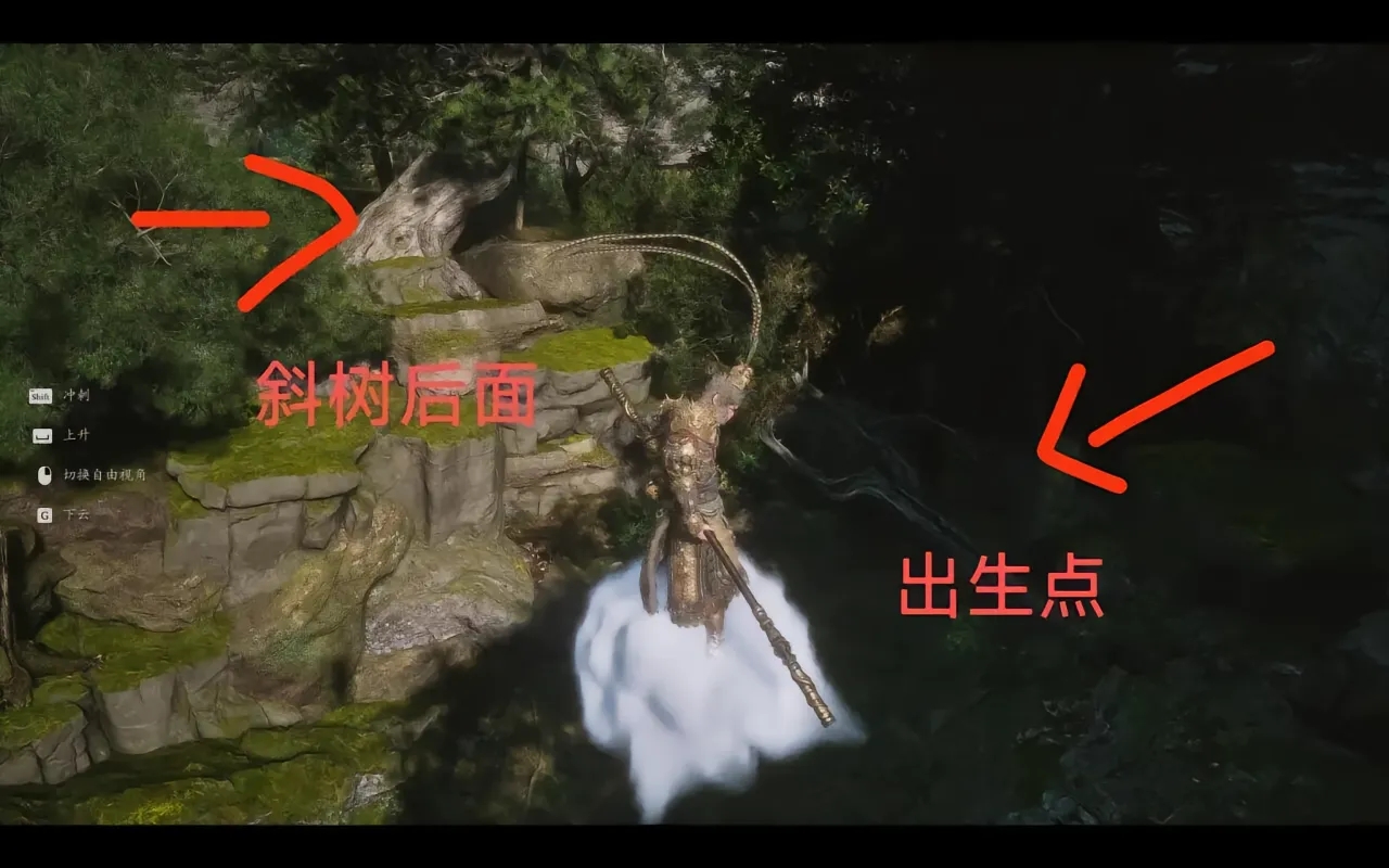 在【花果山-青嶂道】土地廟,沿着下坡的道路一直走到盡頭。來到最開始進花果山的地方,旁邊有一顆歪脖子樹,用筋斗雲飛上去可以看到樹後有寶箱,打開即可獲取