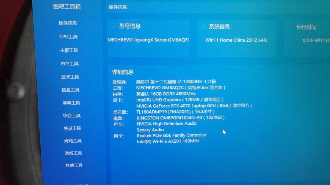 接着第二天新电脑到货,熟悉的天马+金士顿,天马其实没有想象中那么垃圾,只差那一点点色域其实问题不大,亮度充足即可,LCD的极限也就到这了,我自己有LG 42C2外接其实没什么感觉。另外我这台屏幕完美所以我不会换货了,金士顿这块盘相当垃圾,只读还行写入一团糟,特别是同时读写的时候!!所以我只能重新安装系统到我的旧闪迪至尊上(虽然是3.0的盘但是其实4.0和3.0差距不大且这块盘温度不高,很适合笔记本),安装还算顺利,如果也有想换盘的同学我都建议重装不要迁移,可以避免很多bug。方法很简单准备个u盘,去机械革命官网下载镜像安装进u盘,提前下载驱动(具体方案B站有)。
