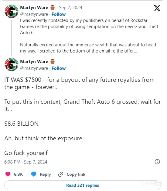 原本Martyn 非常期待,開始想像即將到手的一大筆財富,但是在看到電子郵件底部的報價時,才發現居然只有“7500 美金”(約人民幣5.3 萬元)來永久買斷歌曲未來在遊戲中的相關版權。這讓Martyn 想到《GTA5》總共賺了86 億美金有些不滿,雖然有考慮到對方能帶來的曝光度,但Martyn 還是直接一句髒話要對方滾開,看來是拒絕了對方的報價。