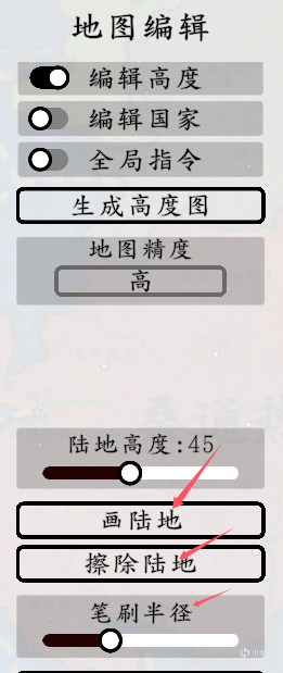 作者很友好,没有设置复杂的方式,我们可以在地图编辑→编辑高度→画陆地/擦除陆地这里找到。