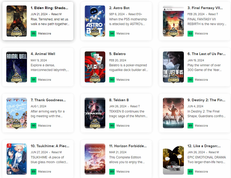 截至發稿時,高居榜首的是備受好評的《艾爾登法環:黃金樹幽影》,以95分的高分傲視羣雄。這款遊戲的出色表現獲得了玩家們和評論家們的一致好評,成爲了今年最亮眼的明星作品之一。