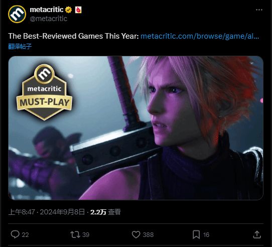 近日,知名遊戲評分網站MetaCritic通過官方推特發佈了一份榜單——2024年迄今爲止評分最高的遊戲排行。該榜單迅速引發了網友們的熱烈討論,紛紛對今年的年度遊戲展開預測。
