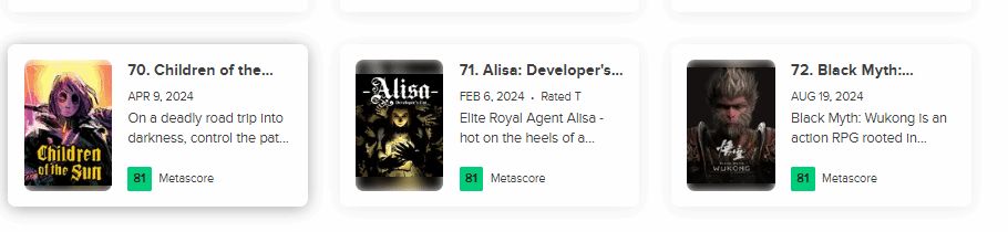 值得一提的是,發售後引發空前熱度的《黑神話:悟空》目前評分爲81分,位列第72位。雖然未能躋身前列,但這款遊戲憑藉其獨特的風格和深刻的內涵,依然贏得了大量玩家的喜愛和支持。