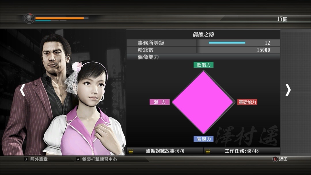 那麼偶像上綜藝節目也是肯定的,我們可以參加各種競技挑戰,把如龍各種小遊戲完美的縫合了進去,玩起來確實和平時有種不一樣的感覺(當中遇到的偶像對手性格迥異,印象最深的就是那個陰陽人哈哈表面我不擅長這些,內心澤村你就是僞善!!裝什麼白蓮花……)