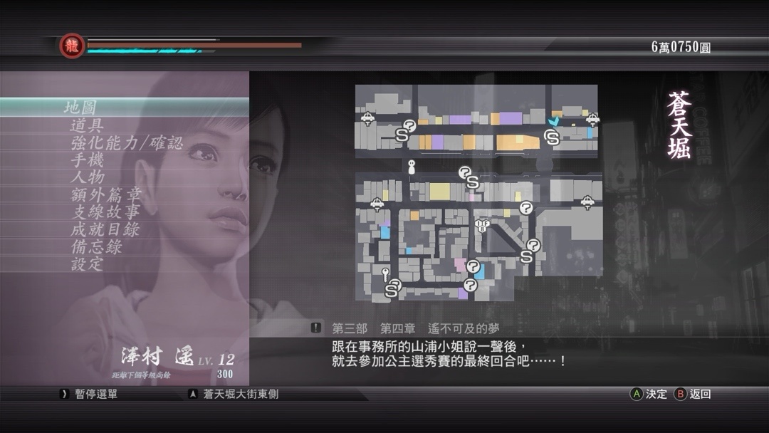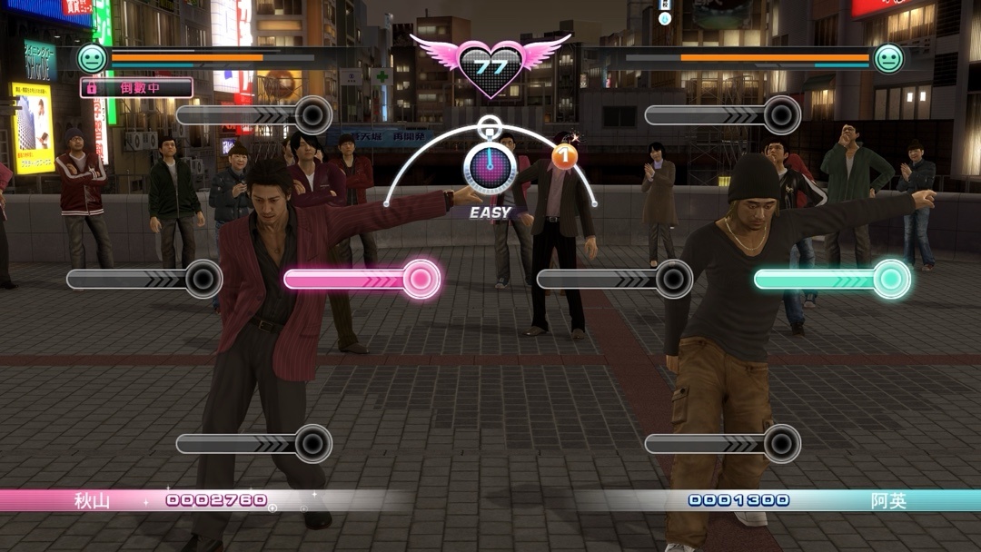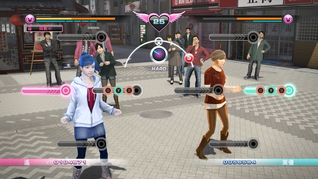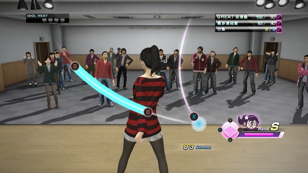 遙通過與街道上各種各樣的舞蹈高手現場pk,這個模式有4種風格類型,也就是代表着四種不同的音樂,戰勝他們獲得能力,成爲稱霸蒼天堀的街舞高手吧~(這個模式有點意思,上下左右切換音遊,要稍微離顯示器遠一點,不然有點難發現從哪邊跳出來,近視眼的痛)