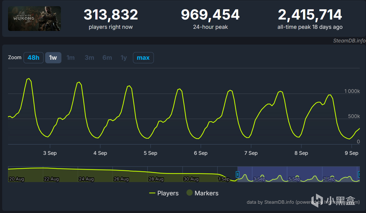 根據SteamDB的數據顯示,《黑神話:悟空》在發售三週後,24小時玩家峯值仍接近百萬,具體數值爲969454。