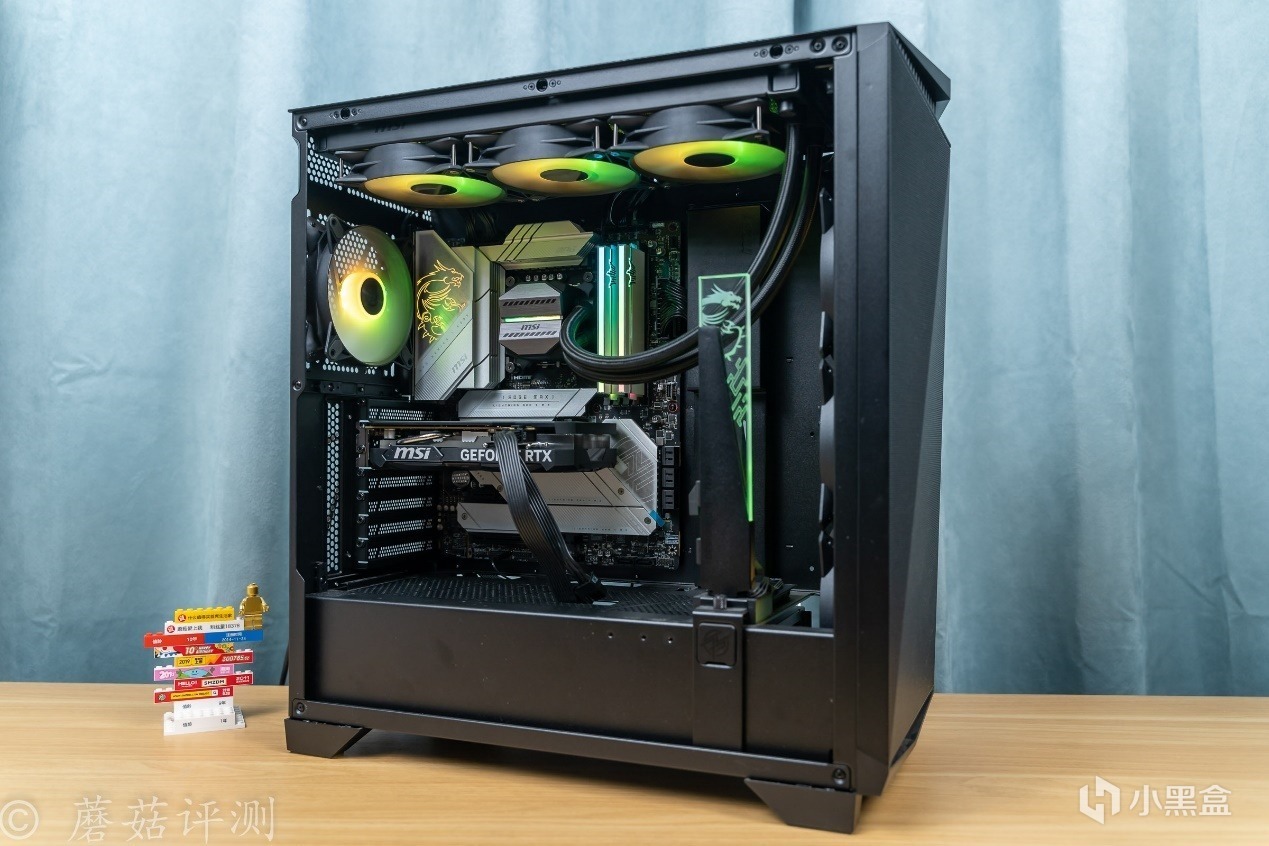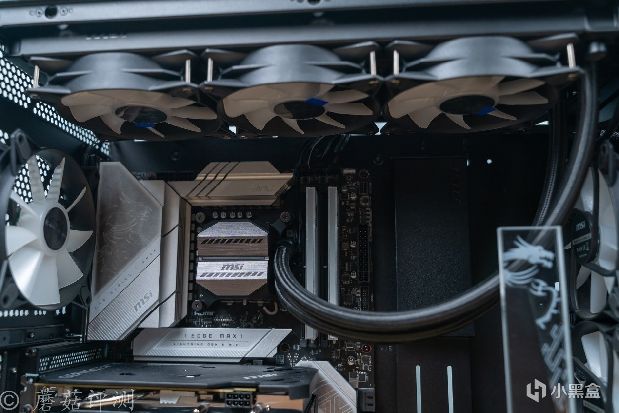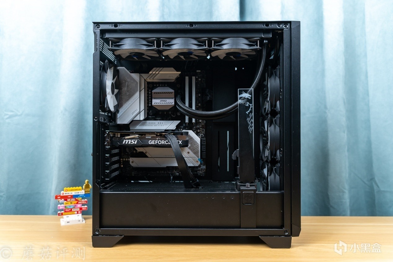 ▼机箱内部的空间非常大,结构非常熟悉,底部是独立的电源仓,机箱顶部可以安装固定水冷排,前部标配有多把机箱风扇。