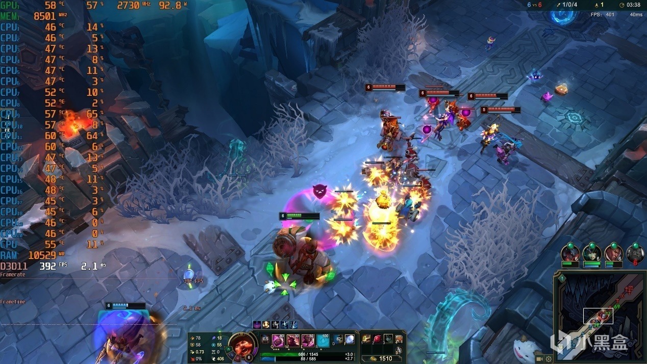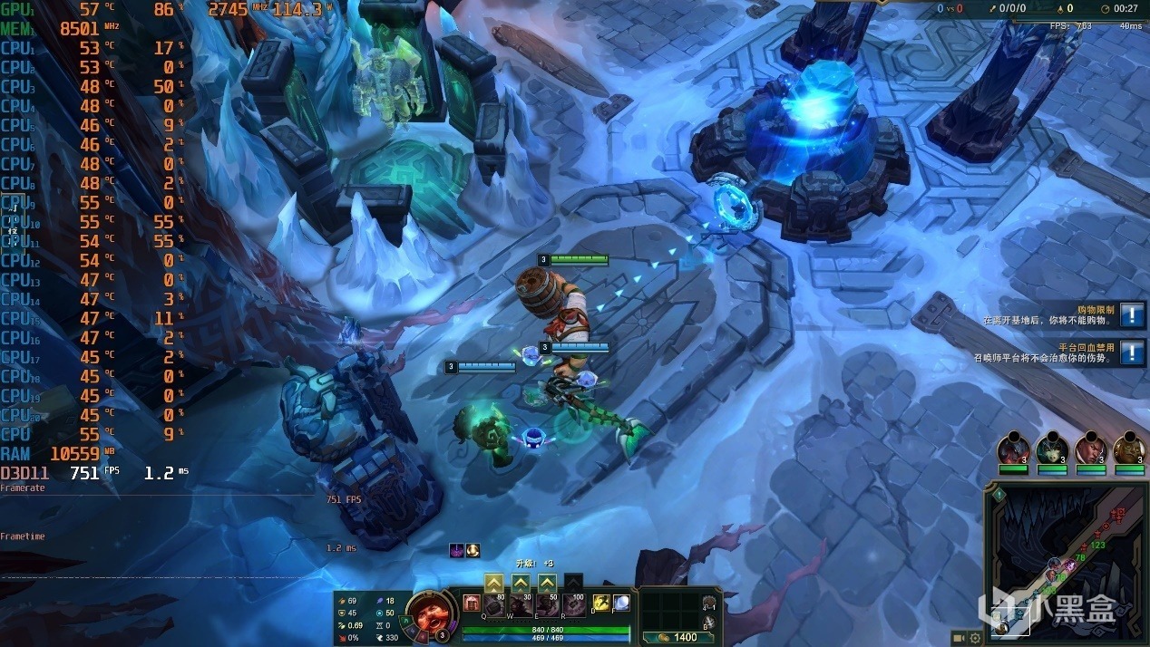▼游戏实测,LOL大乱斗模式,2K分辨率,全极高画质,泉水游戏帧数在751帧左右,非常流畅。