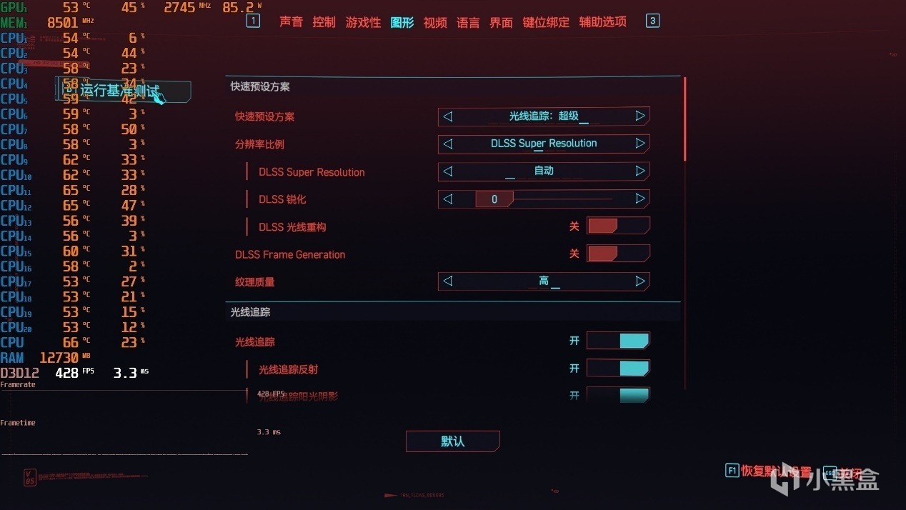 ▼最后是赛博朋克2077,2K分辨率,光追超级特效,这个特殊属实是稍微高了一些,压力有点大。