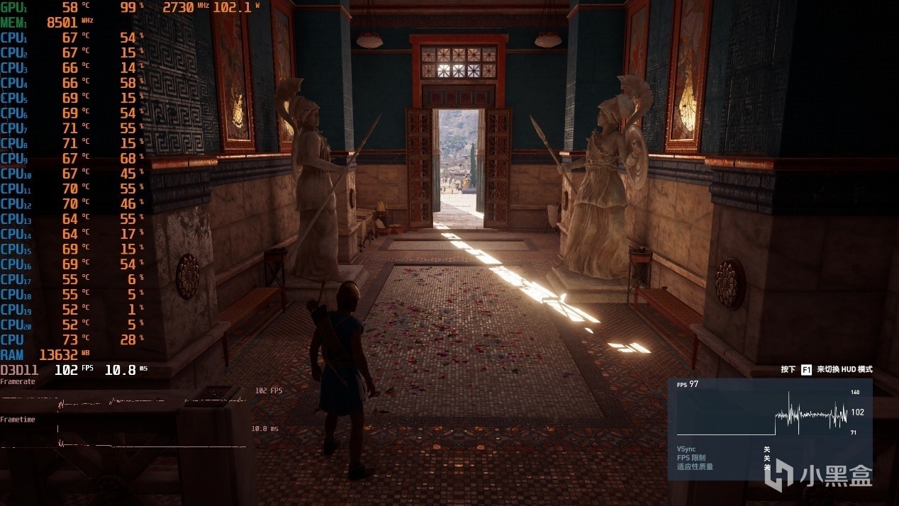 ▼众生平等奥德赛,2K分辨率,全极高画质,体积云最低,走廊游戏帧数在102帧左右,还不错。