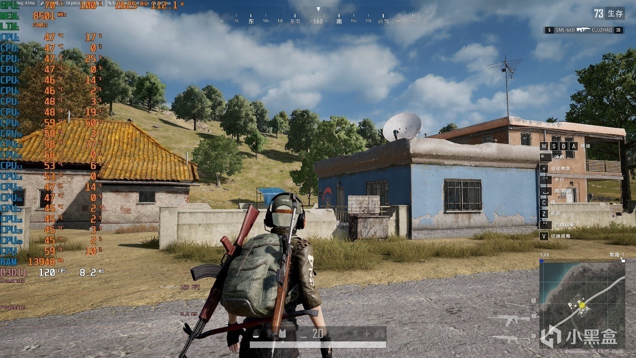 ▼绝地求生PUBG,2K分辨率,全高画质,室外游戏帧数在120帧左右,显卡核心频率2625MHz,功耗112W左右。