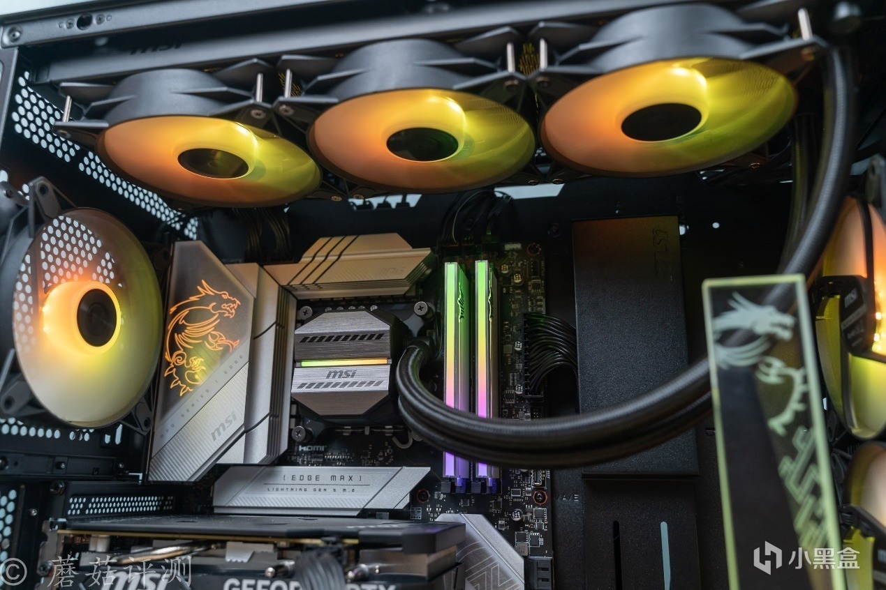 ▼微星这款水冷的水冷头颜值很漂亮,涂装和外观设计是经典的微星迫击炮风格,在水冷头的中间还点缀了一条RGB灯带,乳白色的,柔光效果不错,支持ARGB灯效。