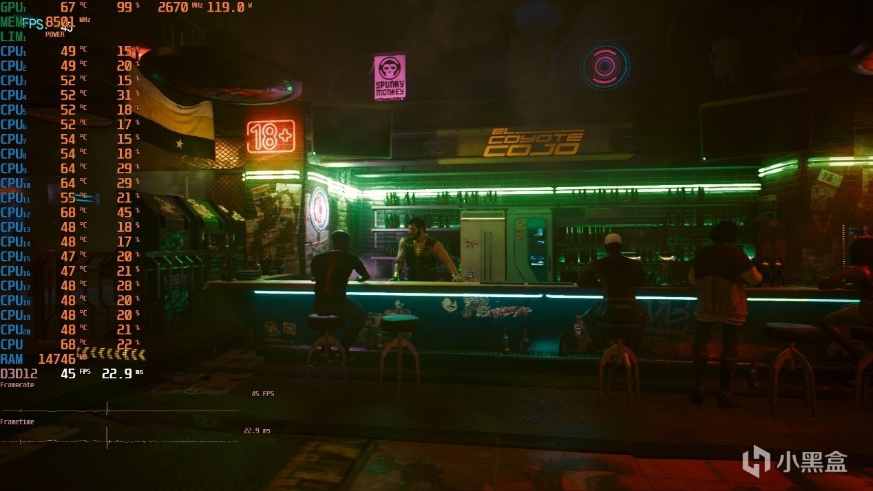 ▼酒吧场景的效果非常不错,游戏帧数在45帧左右,还不错。