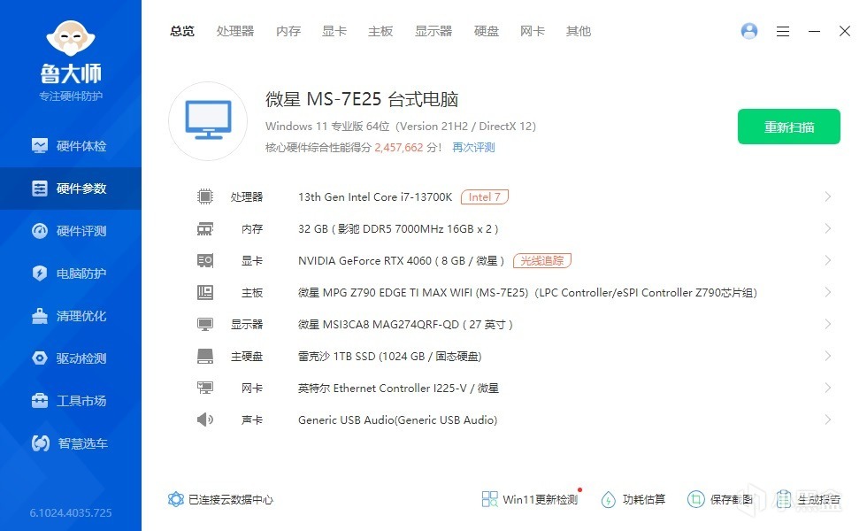 ▼简单看下整机配置,处理器是13700K,主板是微星的MPG Z790 EDGE TI MAX WIFI刀锋钛主板,显卡是影驰RTX4080 Super星曜OC,整机配置很不错。