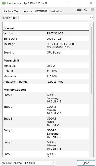 ▼简单看下显卡的BIOS,默认功耗115W,最大功耗115W,RTX40系的显卡功耗是真不高。