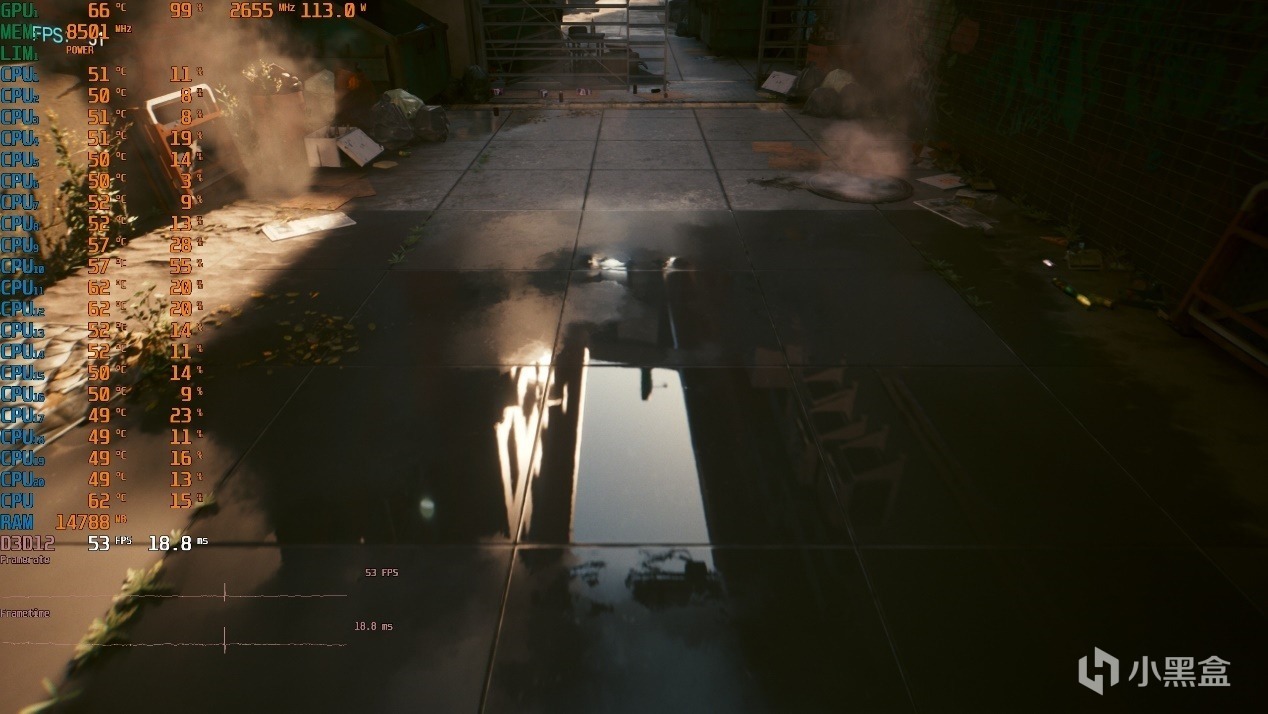 ▼室外水滩的光追效果特别真实,中间的倒影非常棒,游戏帧数在53帧左右。
