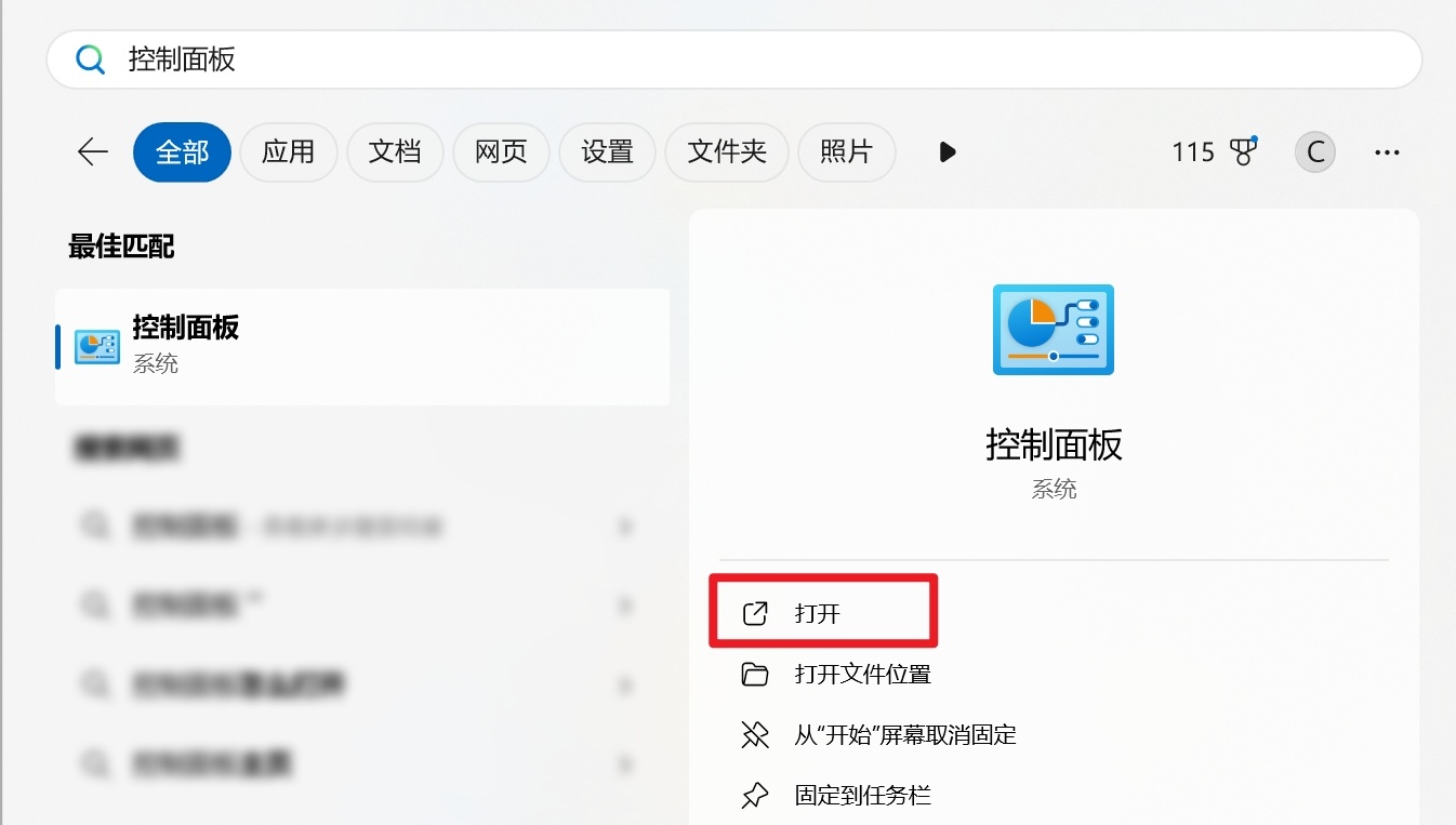 1. 按win键打开windows菜单,并在搜索栏中搜索“控制面板”,打开“控制面板”