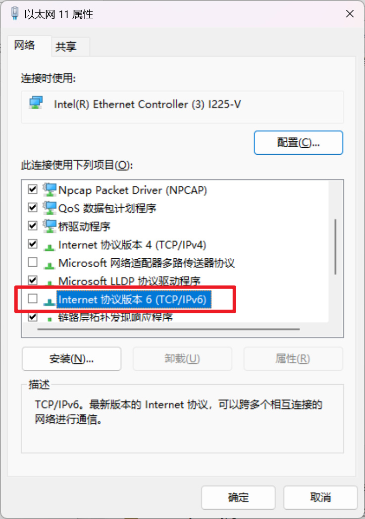 7. 在窗口中滚动滚轮找到IPv6协议,并且点掉前面的勾选框✅,然后点击下方的确定,重启电脑后生效。
