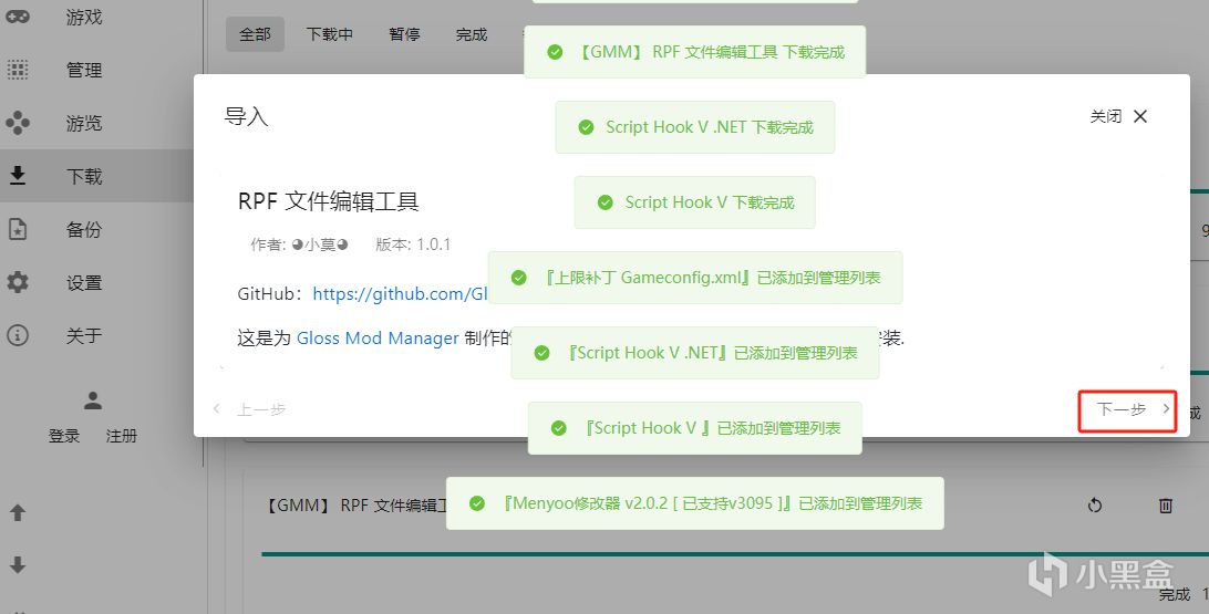 2、点完安装后,在点左边那个下载会弹出导入页面,直接点下一步