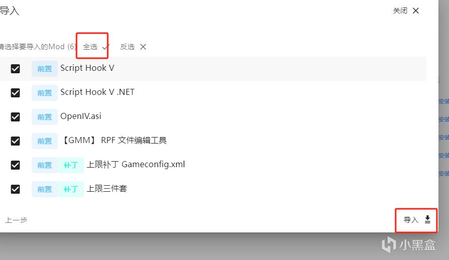 9、全选导入进去就行了也包含了openiv,不用单个的去下载了。