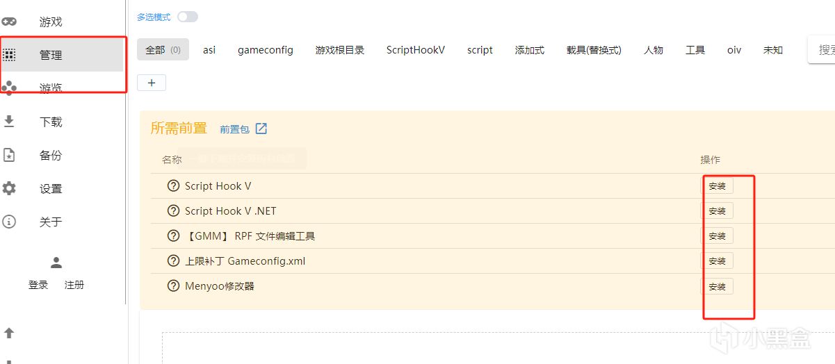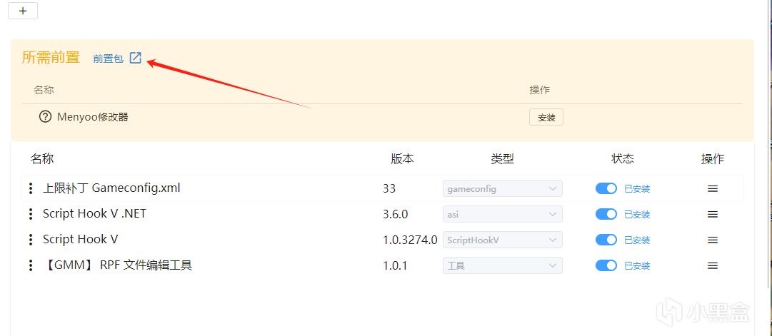 6、在里面找到前置包下载拖进这个管理页面安装即可