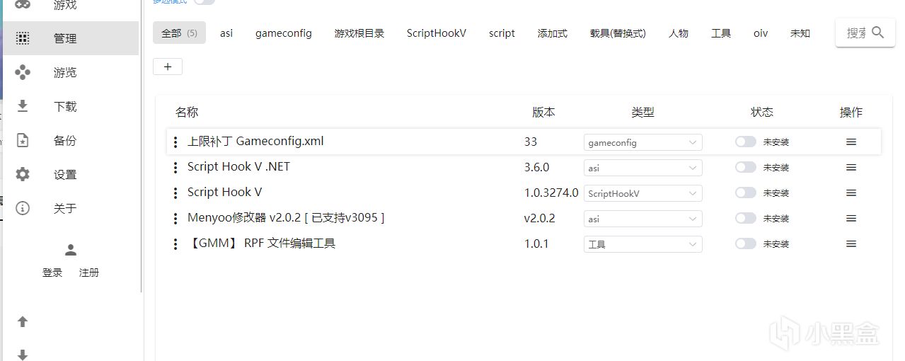 4、导入完成后再点管理,把那些显示未安装的全部安装上