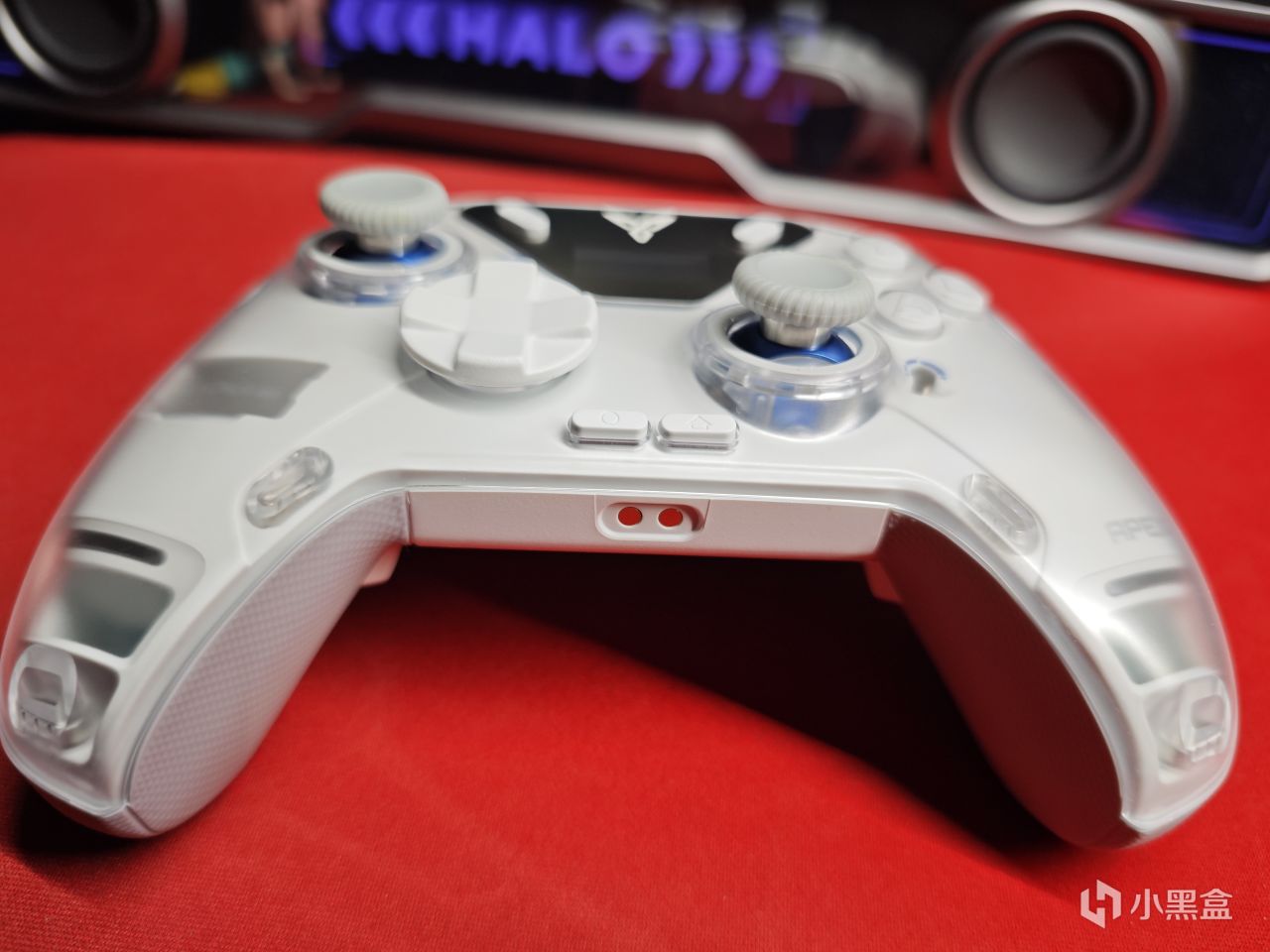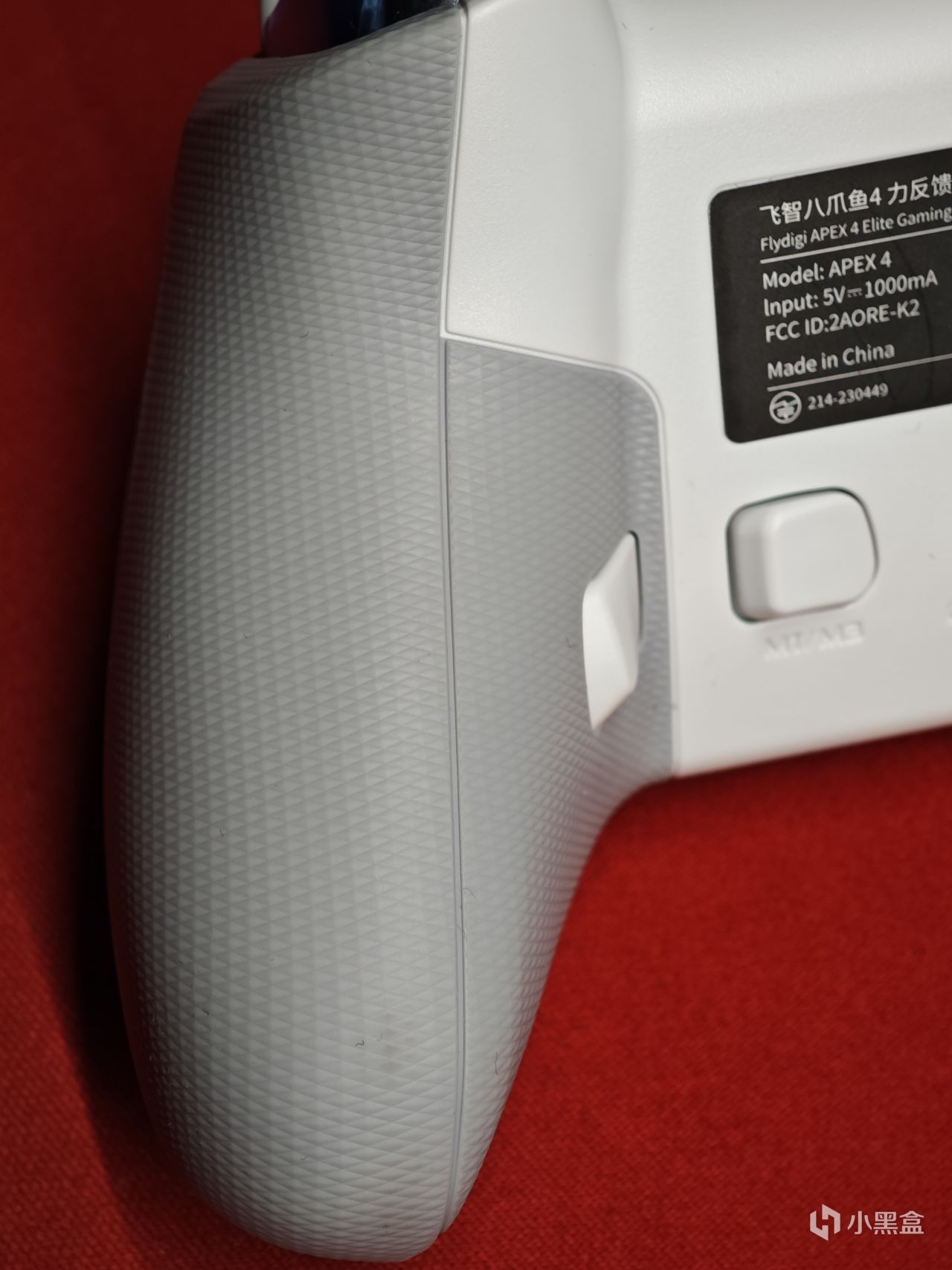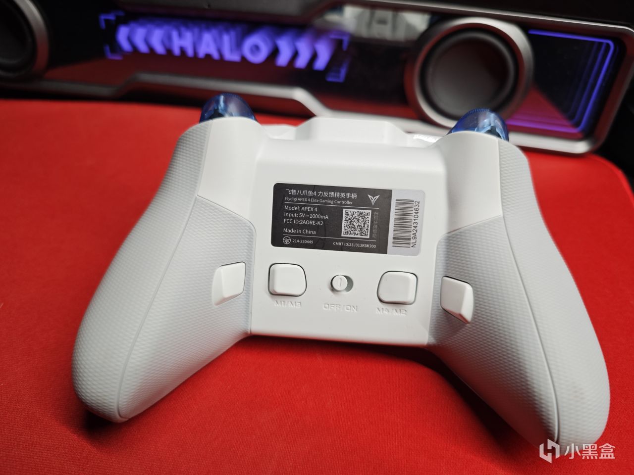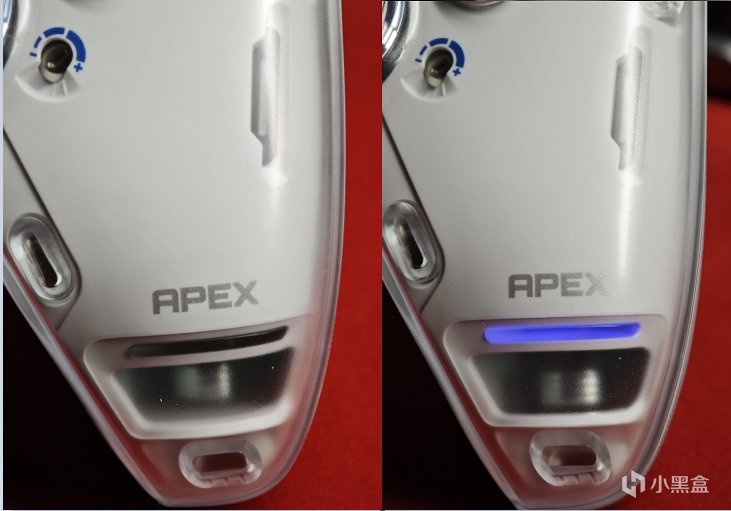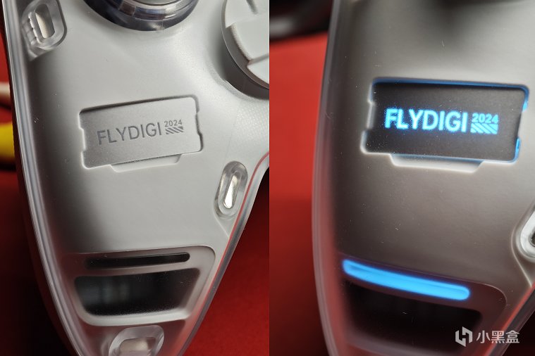 握把处有”FLYDIGI2024”和“APEX”的字样,左边的logo可以发亮。马达处还有一层灯条,整体的颜值更上一层。