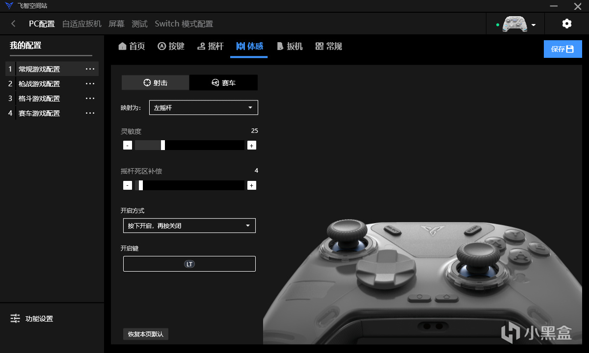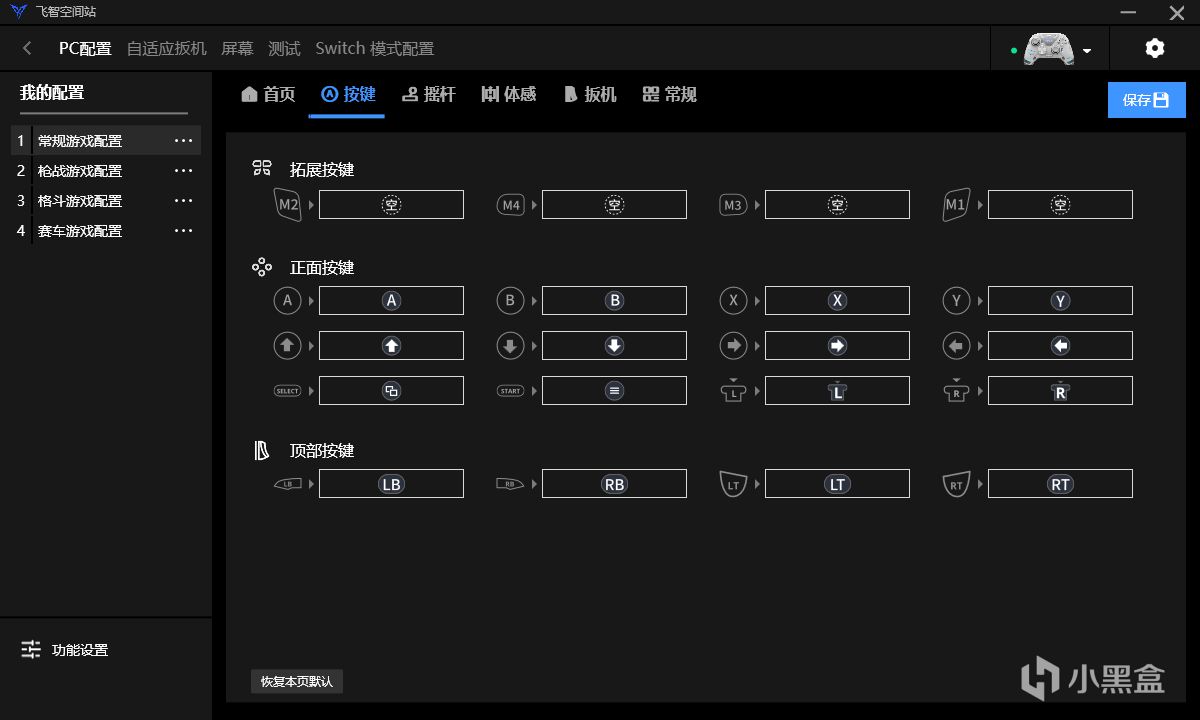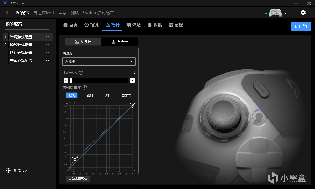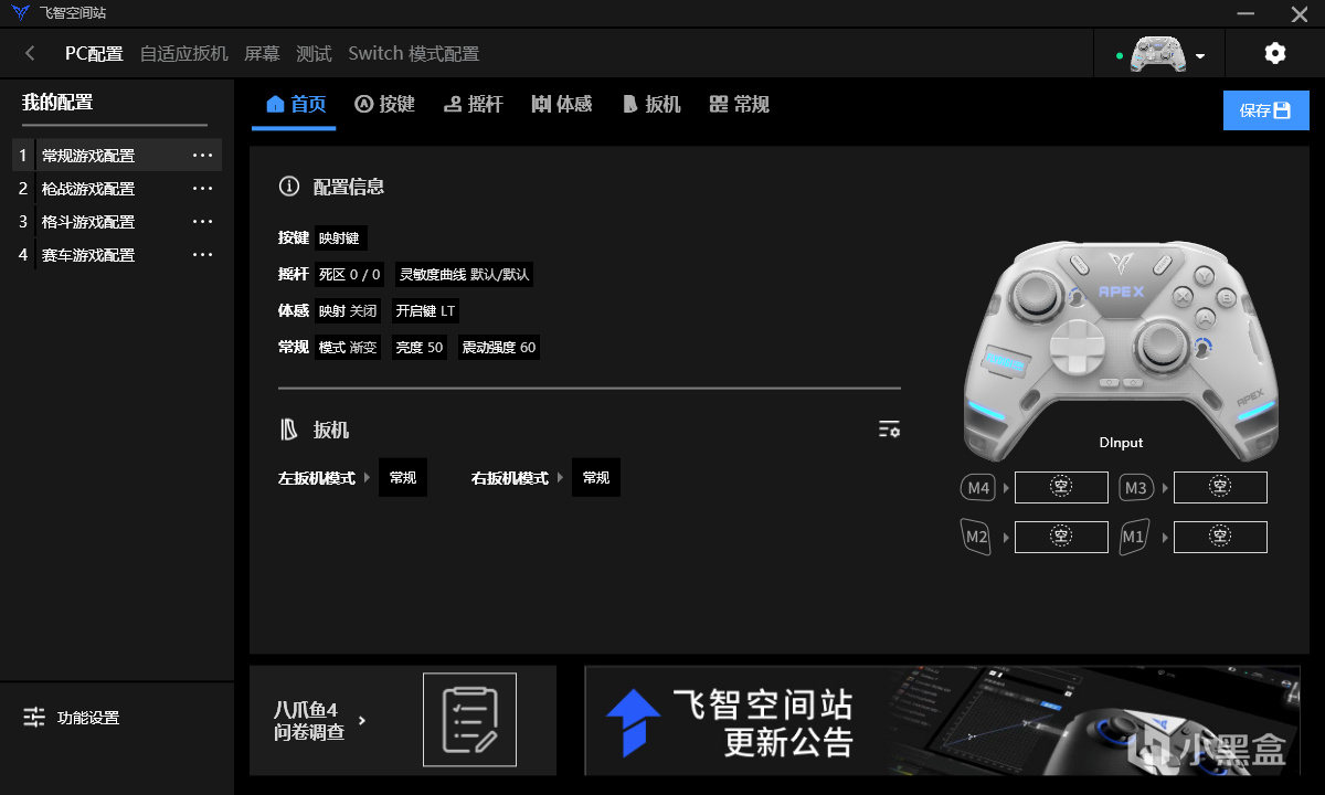 驱动方面可以下载登录飞智空间站,里面可以更改按键、摇杆、体感、扳机、RGB等驱动设置。也可设置Switch模式的配置,中间的小屏幕的DIF也可以根据自己的喜欢设置。
