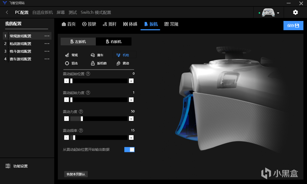 比如我在机枪模式下,轻按扳机后,扳机会持续震动,直到子弹打完。赛车模式下,油门拉满,扳机的力度也逐渐增加。这款扳机无论是线性还是轻触,都能根据自己的需要自定义更改扳机的调节。