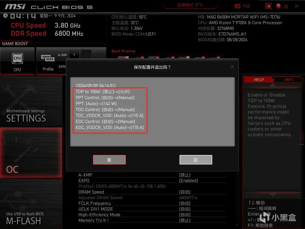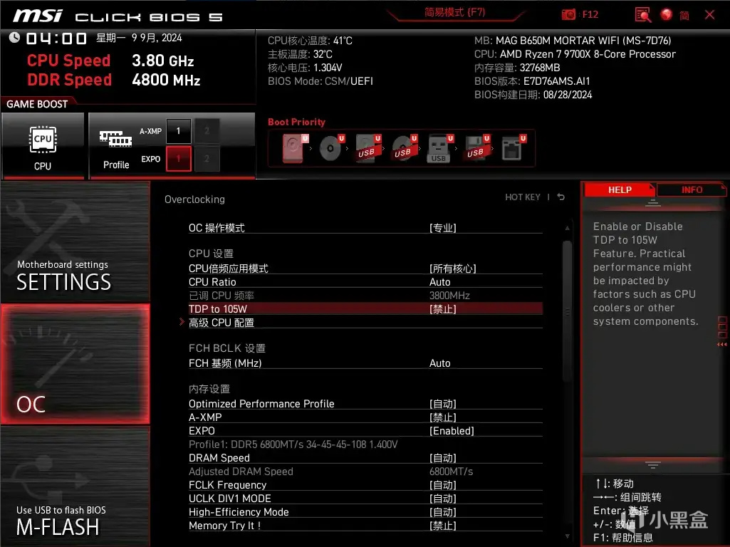 不过最近看到公众号推送,说微星MAG B650M MORTAR WIFI迫击炮主板升级了一个新功能——TDP to 105W,该功能表示可以使65W TDP的AMD锐龙7 9700X和锐龙5 9600X处理器性能提高约13%左右。所以最近我直接去拿小伙伴的整机进行了一个实测,看看这个功能究竟是所谓的“鸡血补丁”还是没啥用的噱头。