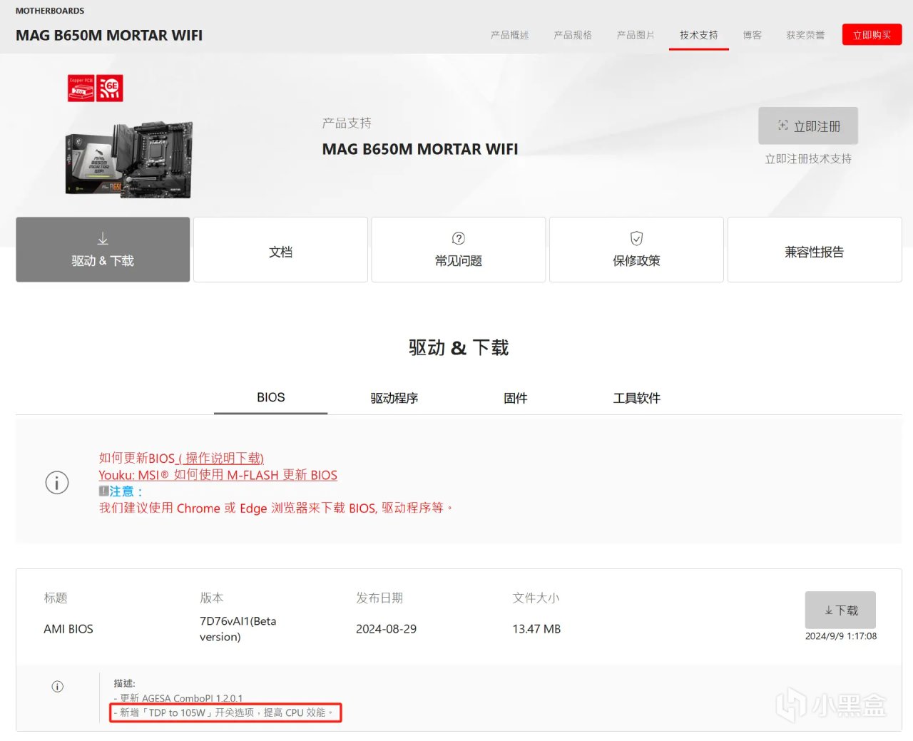 在微星官网的微星MAG B650M MORTAR WIFI迫击炮主板的技术支持界面可以找到这个BIOS,目前还是Beta版本,为7D76vAI1。