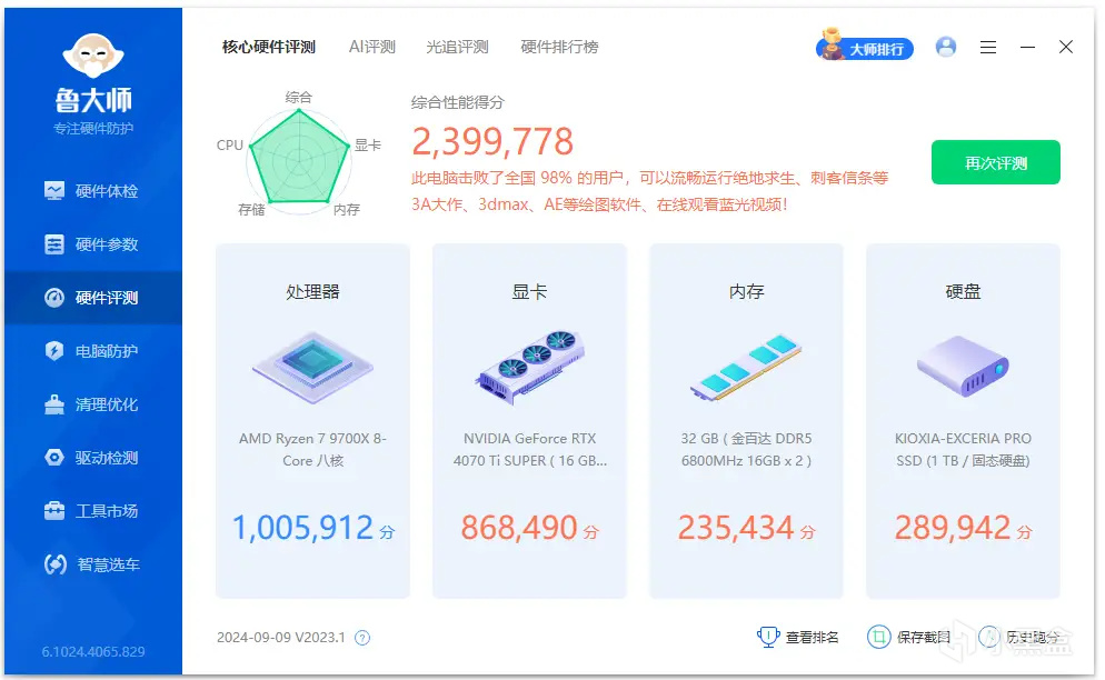 鲁大师CPU得分也破百万,达到了1005912