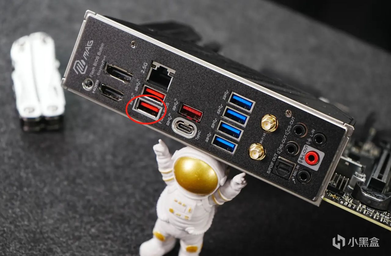 这里也说明一下,如果有的小伙伴使用该主板无法使用点亮最新的锐龙9000处理器,也可以试试盲刷模式。将下载好的BIOS文件改名成MSI.ROM放在FAT32格式的U盘中,接入到下方红色所标识的USB接口;再接好CPU供电与主板供电,最后按下I/O挡板最上方的Flash BIOS Button按键,就可以开启无U盲刷BIOS。