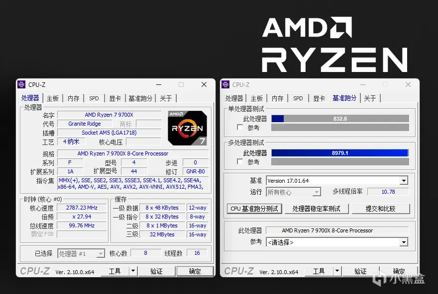 CPU-Z单核得分为832.8,多核分数暴涨了不少,接近9000,达到了8979.1