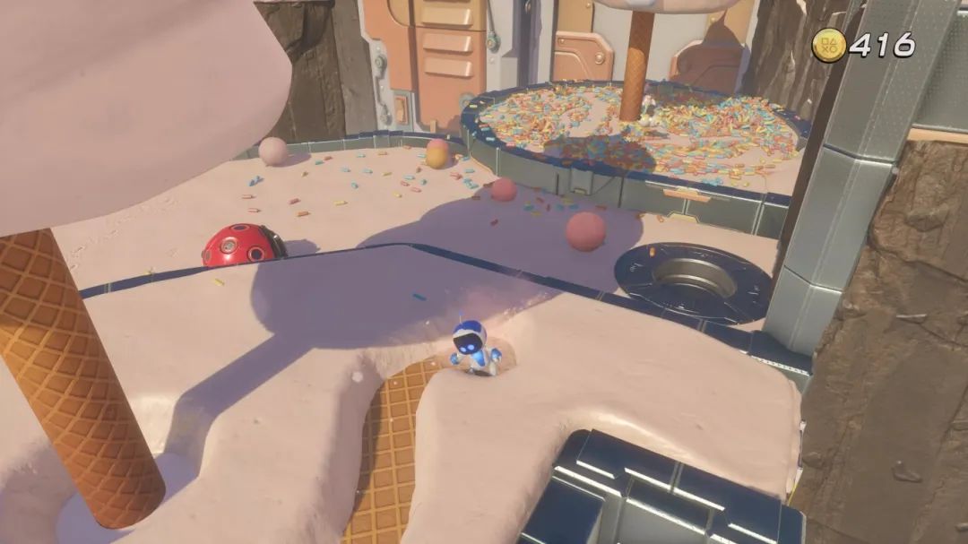 触觉反馈方面,许多关卡与能力会特地营造爽点,比如,铁球在铁钉上叮呤咣啷、跌宕起伏的滚动;被重物挤压时的阻力、在水中漫步的丝滑;将液体吸入容器时浓稠的质感、力的方向感;又或是行走在甜点上,同时感受雪的绵密、华夫饼的酥脆和糖针的颗粒感。这般层次感带来的体验是独一无二的。