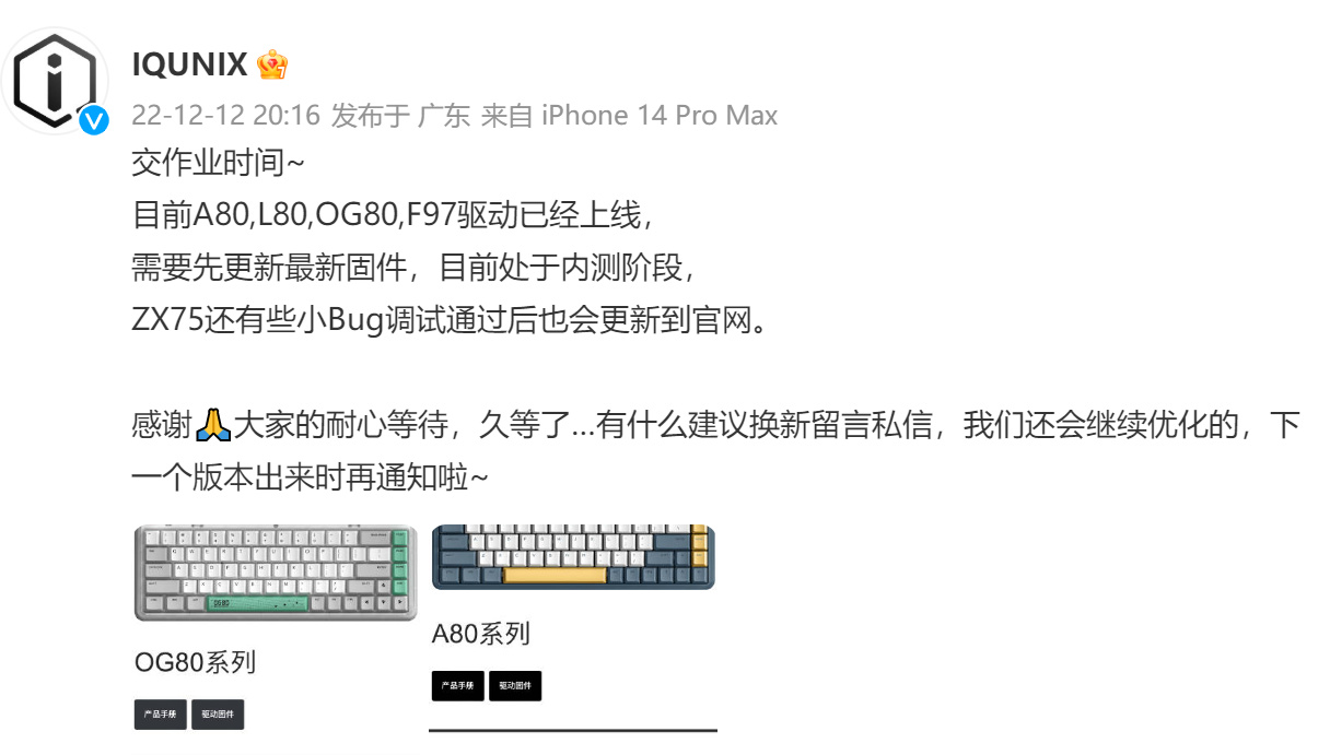 IQUNIX官方动态 有需要的水友可以看一下目前A80,L80,OG80,F97驱动已经上线需要先更新最新固件,目前处于内测阶段,ZX75还有些小Bug调试通过后也会更新到官网。