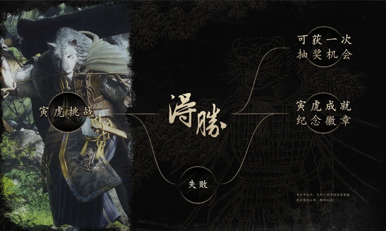 兩命挑戰寅虎,只要參與即可獲得紀念徽章! 、成功擊敗寅虎,可獲得一次抽獎機會,有機會抽中的幸運獎品爲:《黑神話:悟空》實體收藏版《黑神話:悟空》×吉考斯工業【心猿】服裝《黑神話:悟空》×機核合作T恤 服裝爲公平起見,天命人的等級裝備數據將在現場公佈,期待切磋!